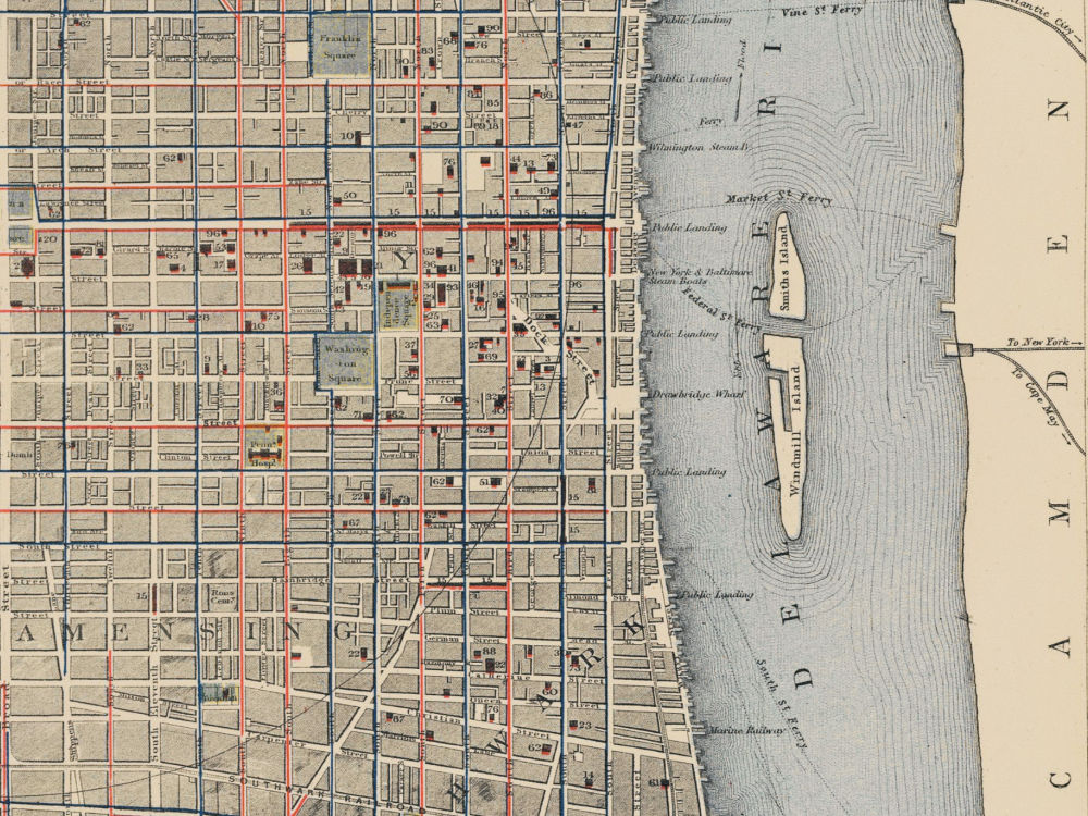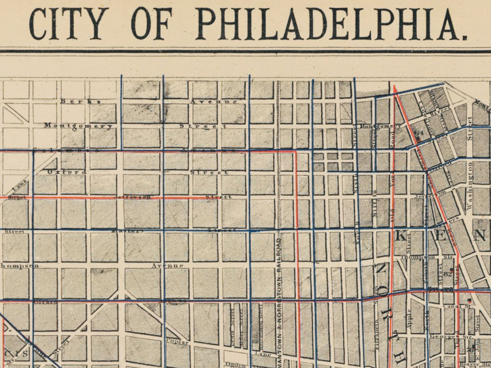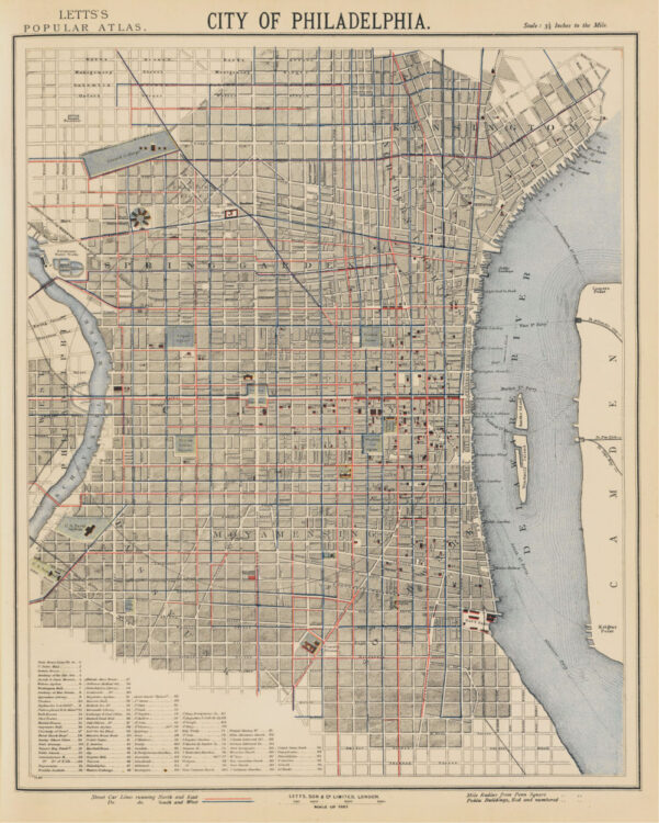 Vintage Map of Philadelphia from 1883 published by Letts & Sons. Showing major buildings, street car lines, wharves and the radial distances from Penn Square.