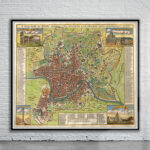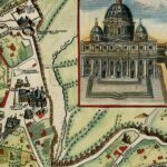 John Sennex’s 1721 map of Rome covering the city and surrounding countryside. Shows the Coliseum, the Vatican, the Pantheon, and various other monuments, monasteries, and churches. Each corner is decorated with an engraved image of an important Roman monument, including the Ruins of The Amphitheater of Vespatian, St. Peter’s Church & The Pope’s Palace, Trajan’s Pillar, and the pyramidal Sepulcher of Caijus Cestus.