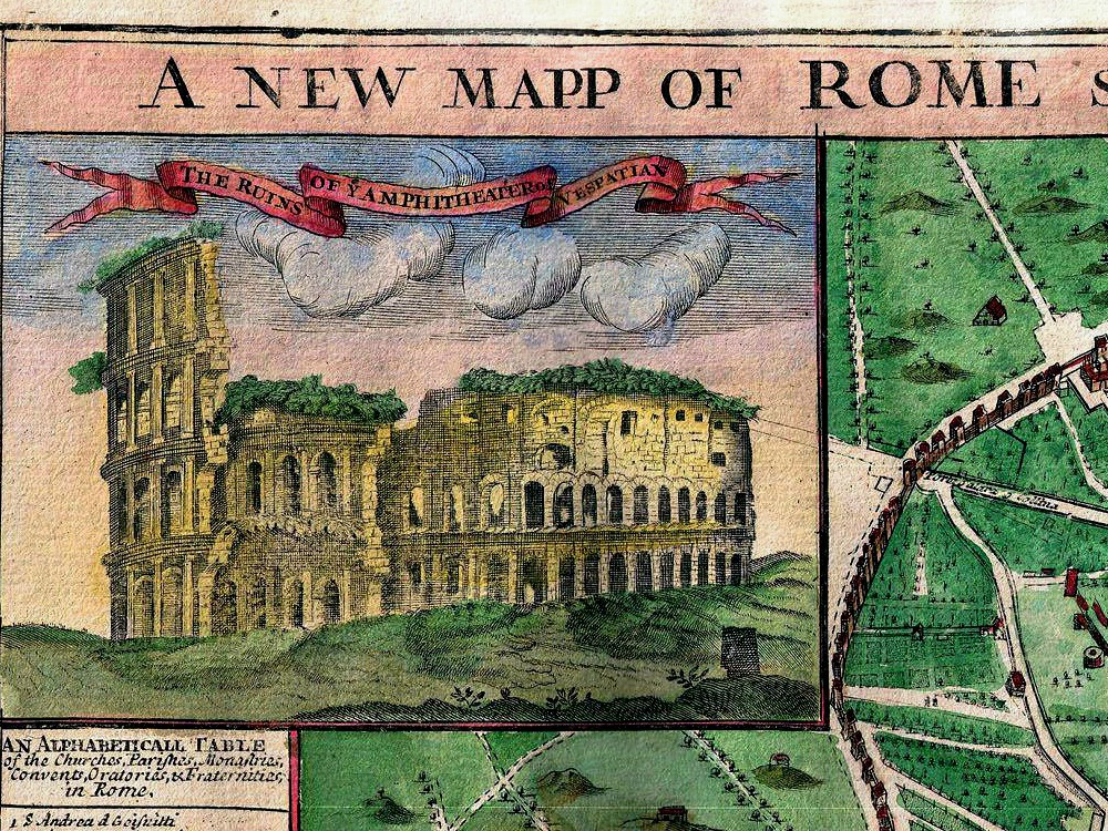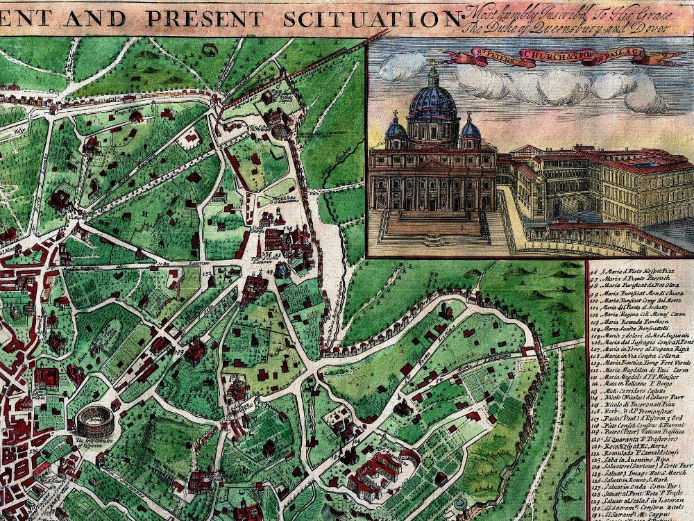 John Sennex’s 1721 map of Rome covering the city and surrounding countryside. Shows the Coliseum, the Vatican, the Pantheon, and various other monuments, monasteries, and churches. Each corner is decorated with an engraved image of an important Roman monument, including the Ruins of The Amphitheater of Vespatian, St. Peter’s Church & The Pope’s Palace, Trajan’s Pillar, and the pyramidal Sepulcher of Caijus Cestus.