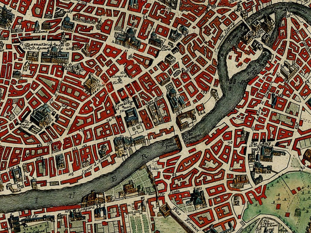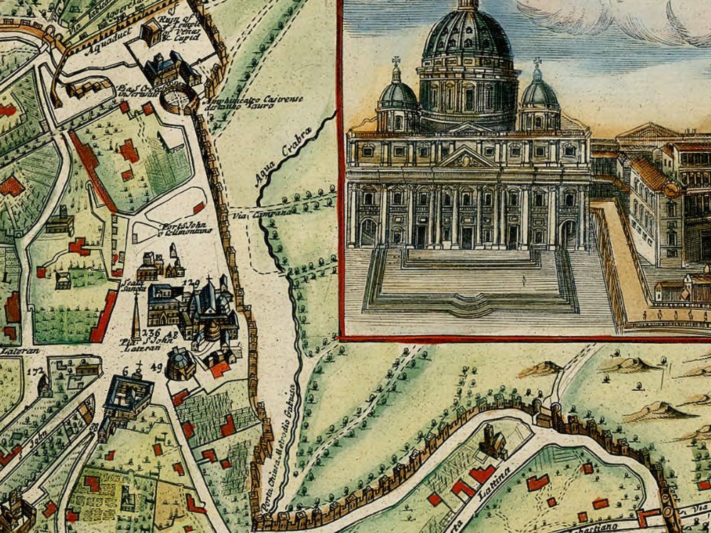 John Sennex’s 1721 map of Rome covering the city and surrounding countryside. Shows the Coliseum, the Vatican, the Pantheon, and various other monuments, monasteries, and churches. Each corner is decorated with an engraved image of an important Roman monument, including the Ruins of The Amphitheater of Vespatian, St. Peter’s Church & The Pope’s Palace, Trajan’s Pillar, and the pyramidal Sepulcher of Caijus Cestus.