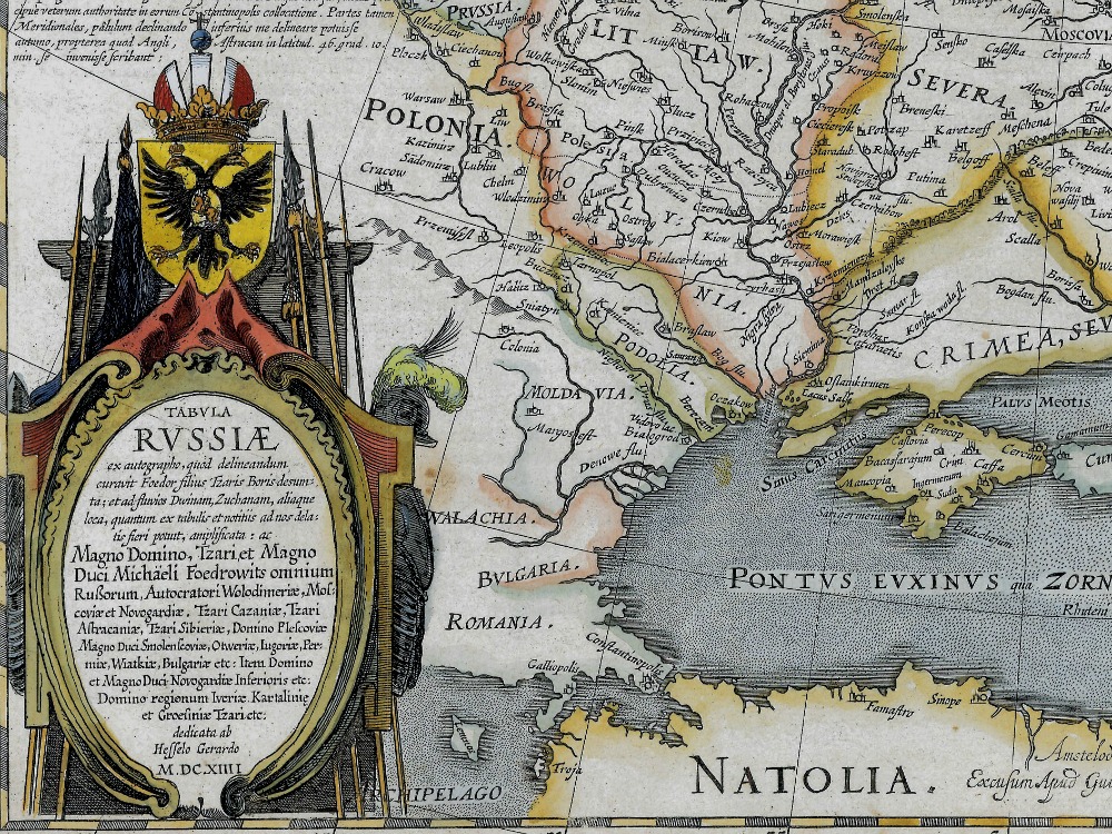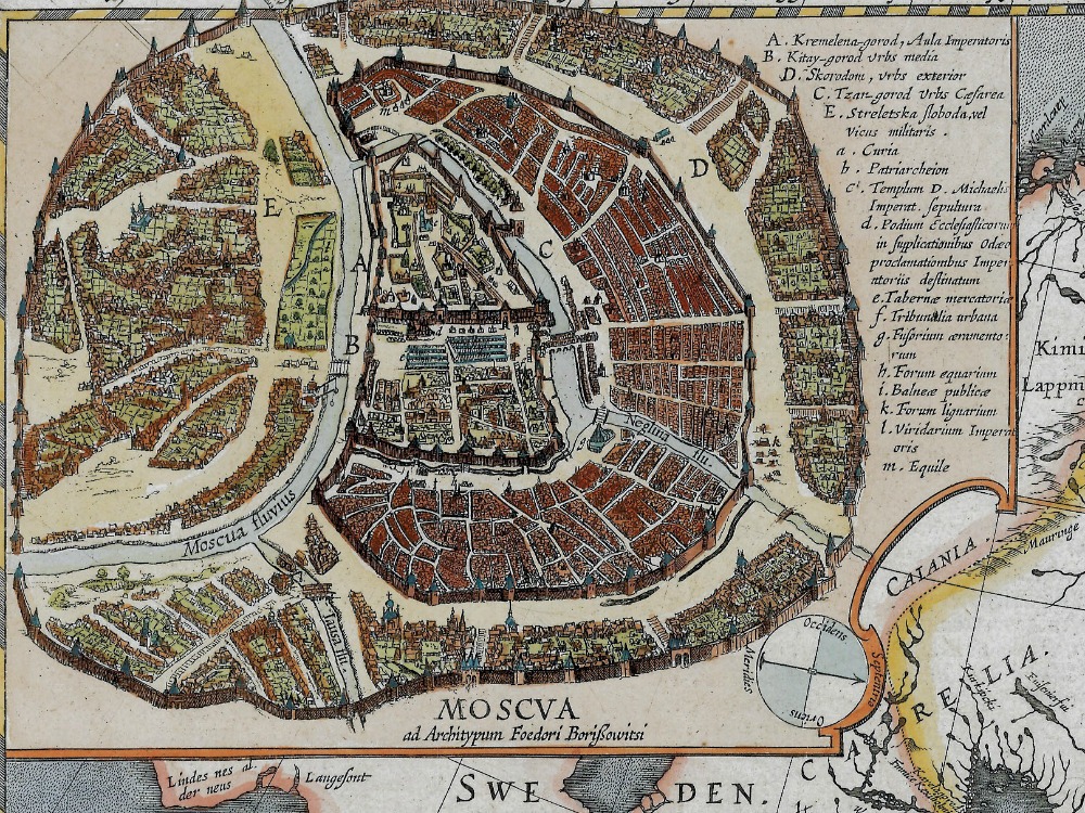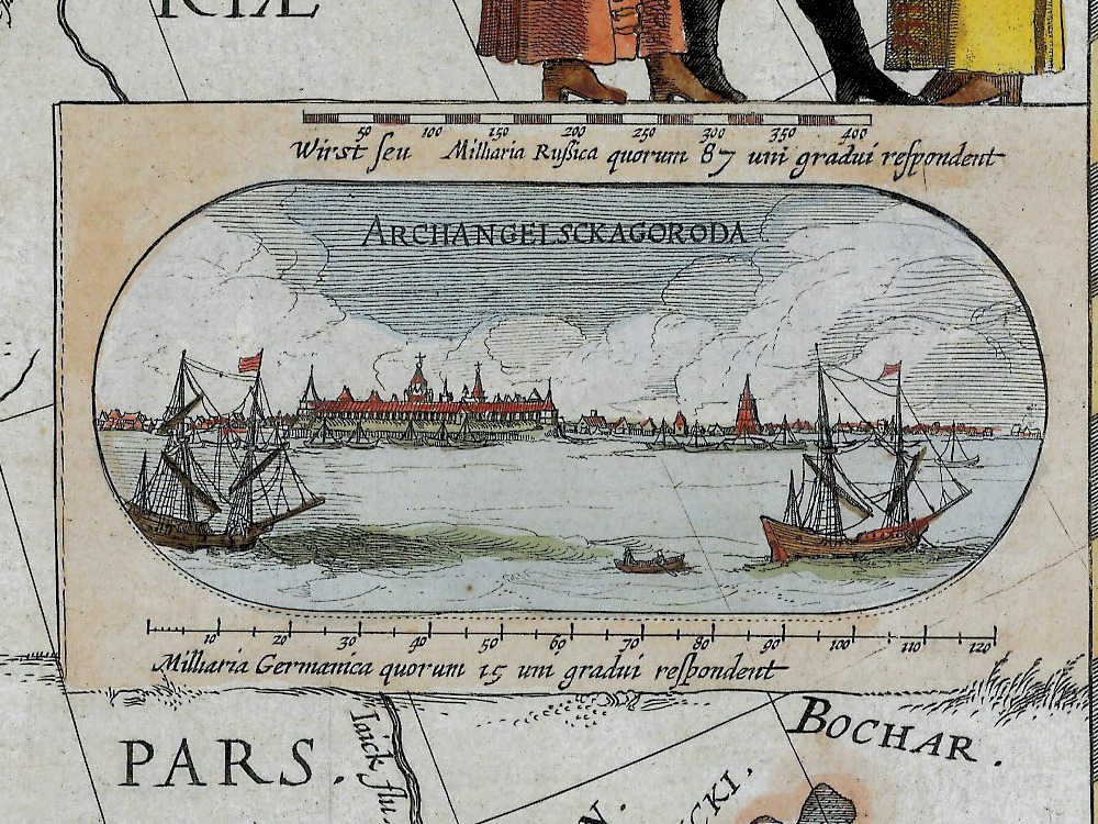 Blaeu’s 1635 map of Russia with an insert plan of Moscow and a view of Archangelsckagoroda.The map depicts hundreds of villages and cities, forests, and river systems.