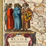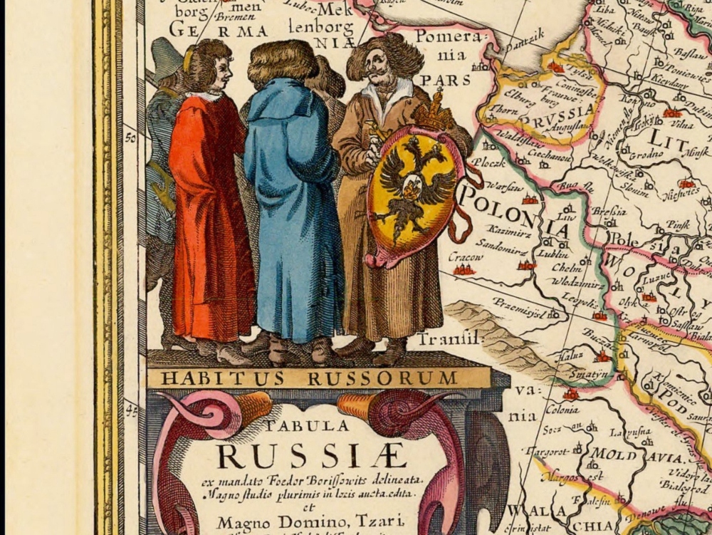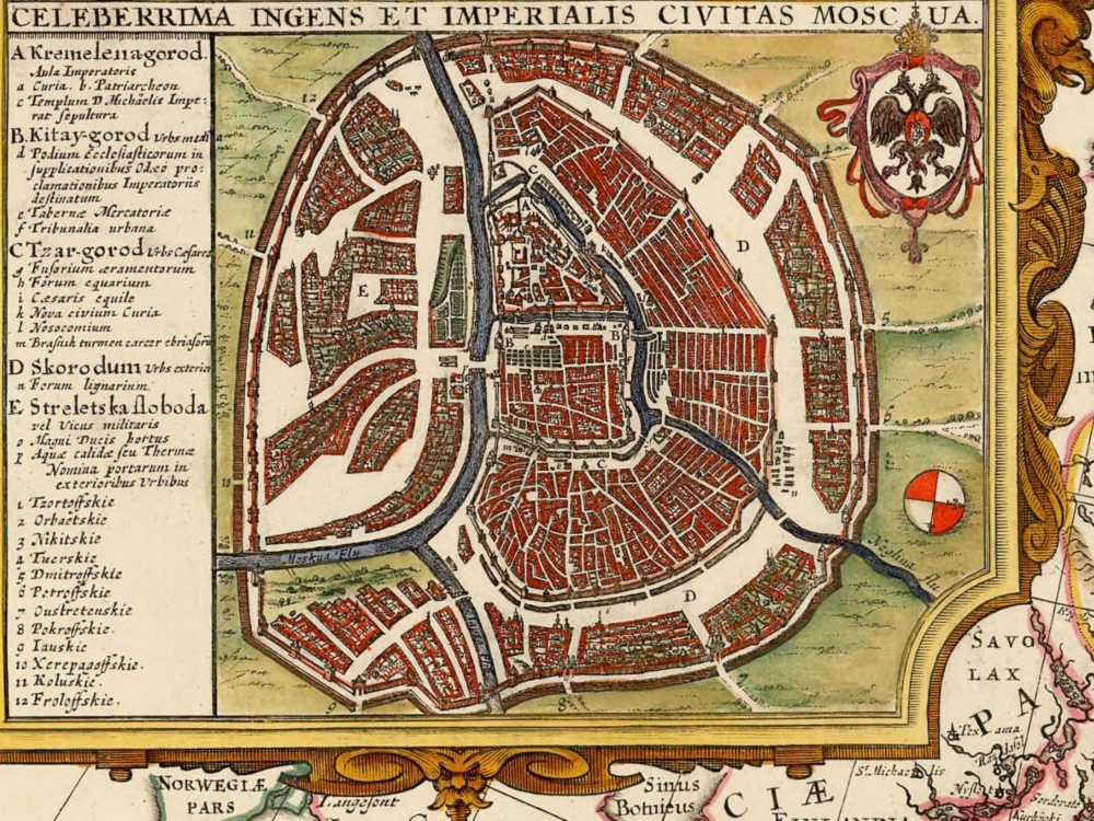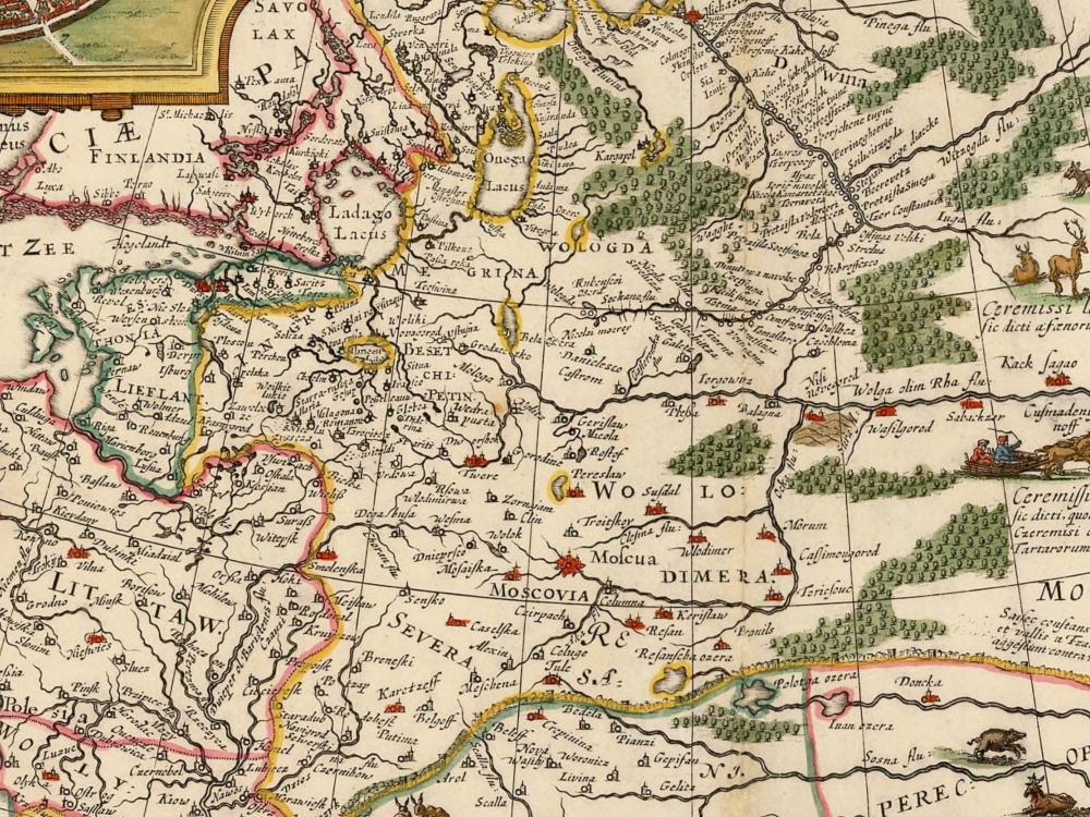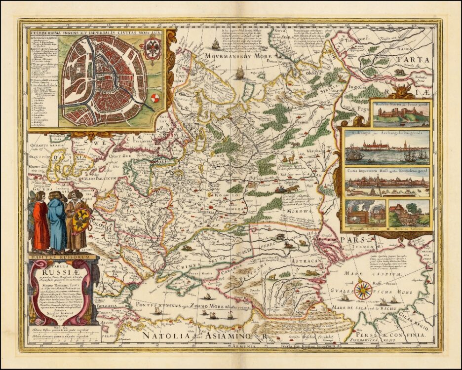 Nicolaus Visscher’s map of Russia from 1651. The map covers the European part of the Russian Empire extending from Poland to Tartary, and from the Barents Sea to the Black and Caspian Seas. Also shown is a large inset plan of Moscow includes a legend identifying locations. On the right hand side are five insets with views of cities.