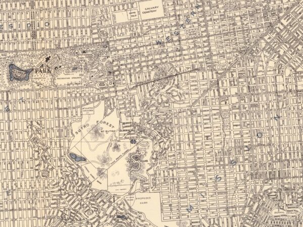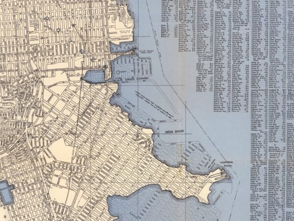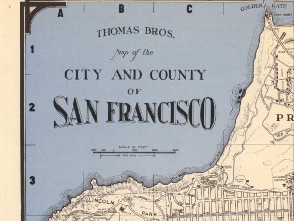Thomas Bros. Pocket Map of San Francisco from 1945 will brighten up any wall. It covers San Francisco from Lake Merced in the South to the Golden Gate Bridge in the North. A street index is included on the right hand side of the map.