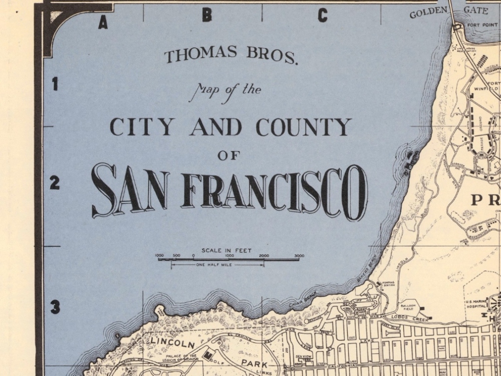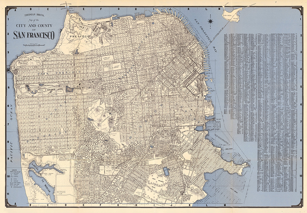 Thomas Bros. Pocket Map of San Francisco from 1945 will brighten up any wall. It covers San Francisco from Lake Merced in the South to the Golden Gate Bridge in the North. A street index is included on the right hand side of the map.