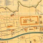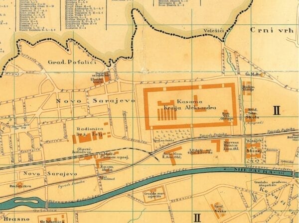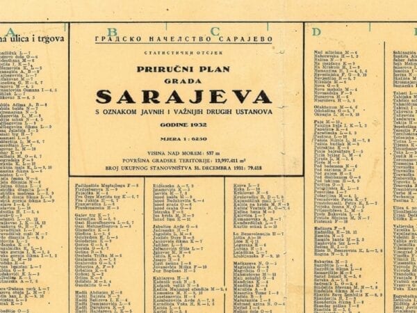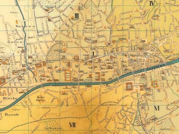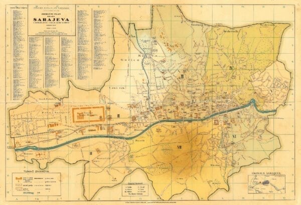 A stunning map of Sarajevo from 1932 showing the boundaries of the city the street names, public buildings, mosques, parks and other public spaces.