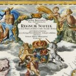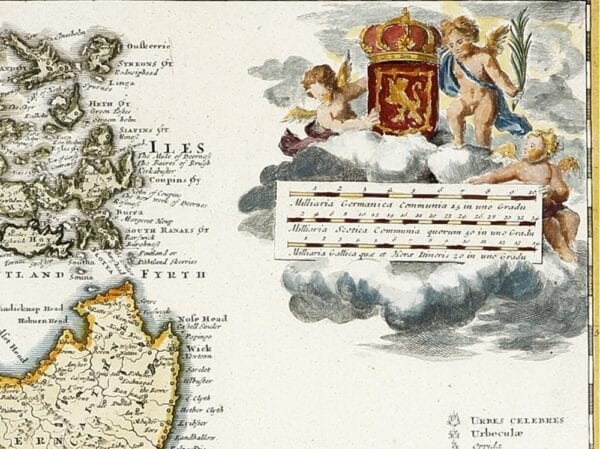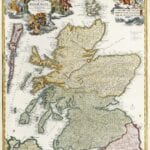 J.B. Homann’s beautiful map of Scotland from 1737. The map is filled with minute detail and hundreds of place names. Superb title and distance scale cartouches surrounded by mythical figures and the royal and Scottish arms.