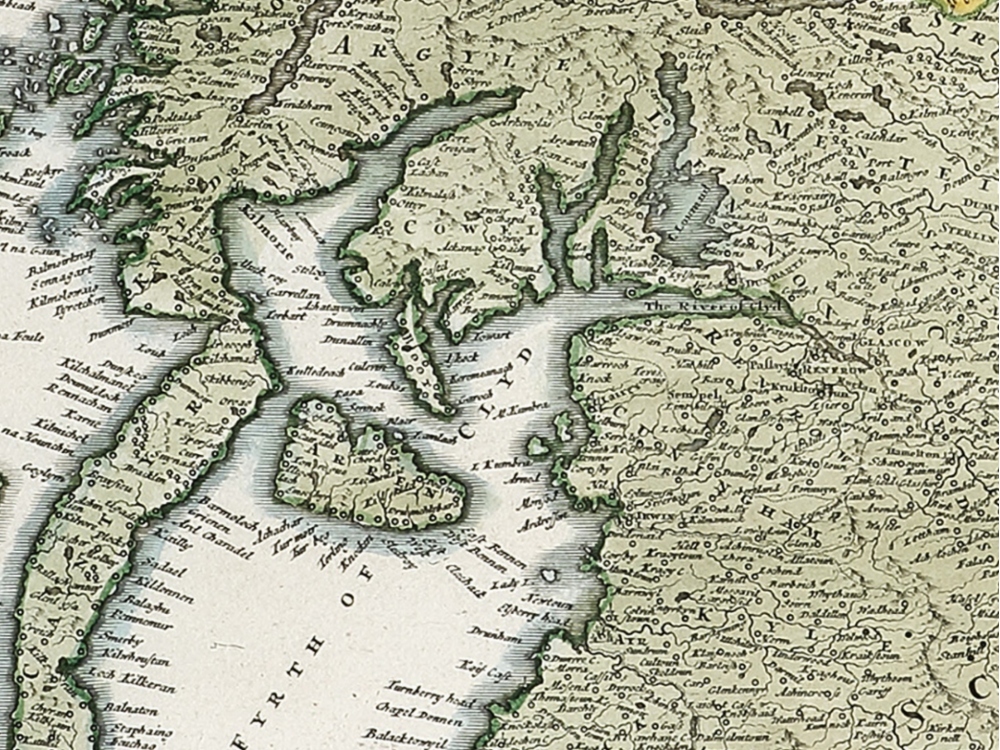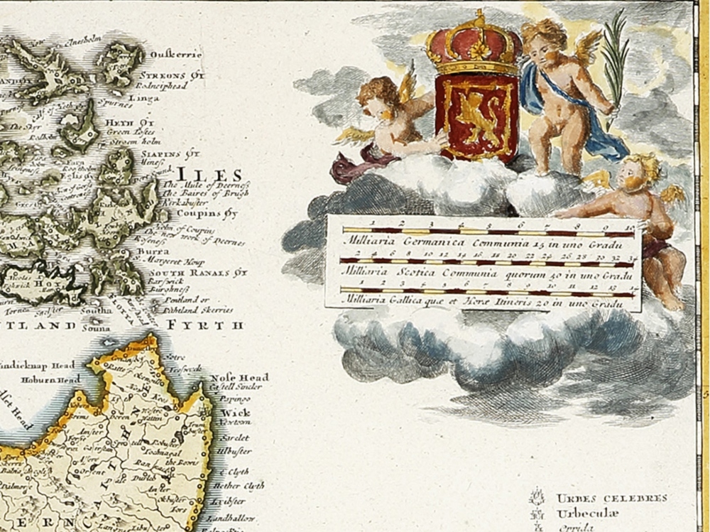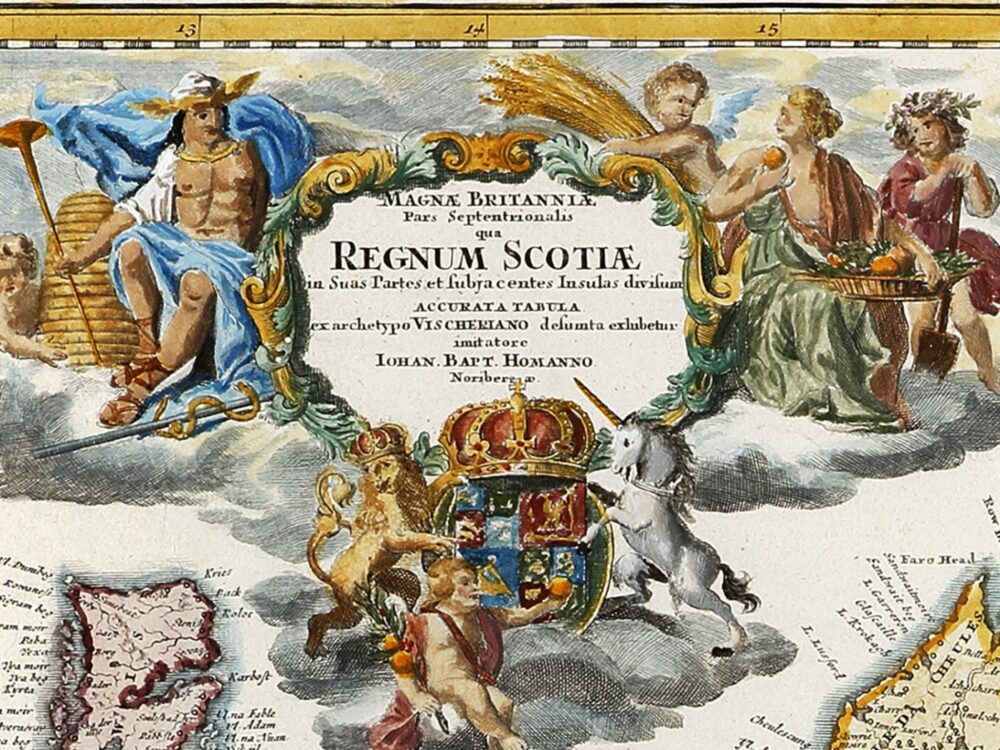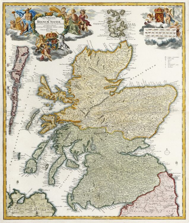 J.B. Homann’s beautiful map of Scotland from 1737. The map is filled with minute detail and hundreds of place names. Superb title and distance scale cartouches surrounded by mythical figures and the royal and Scottish arms.