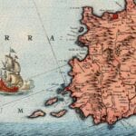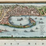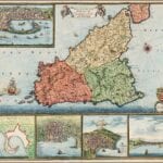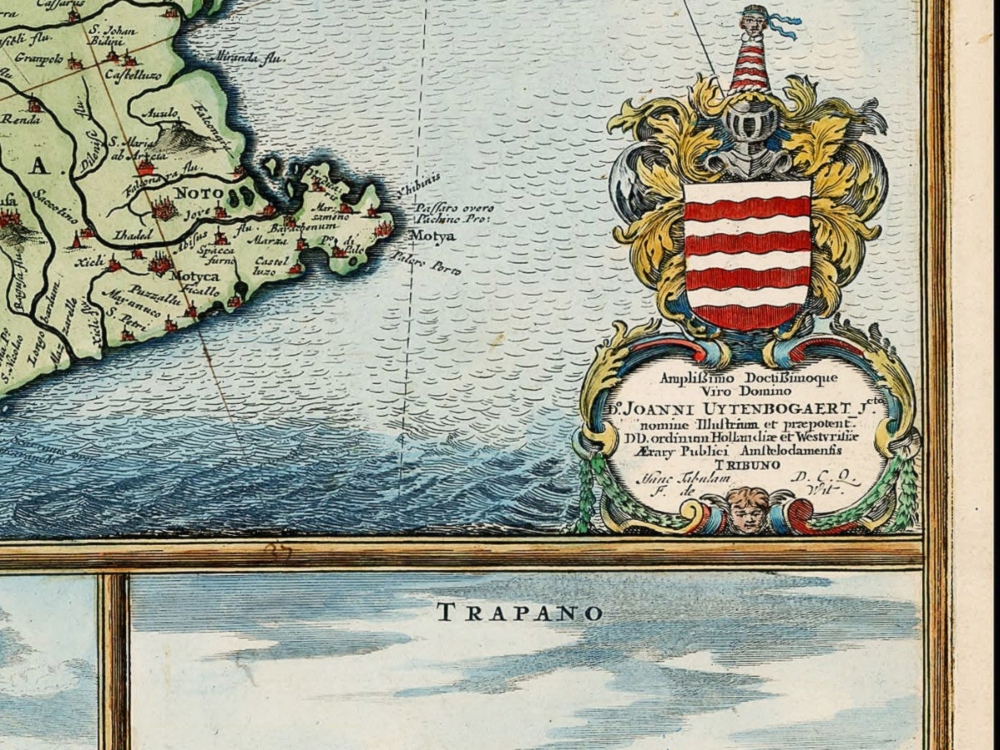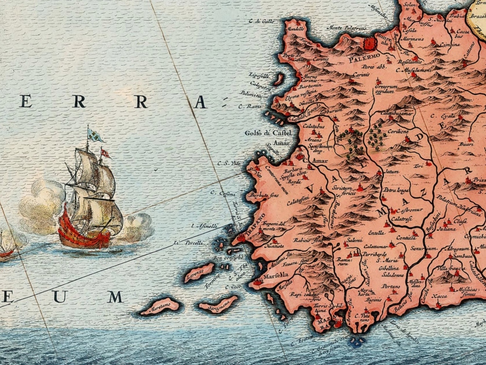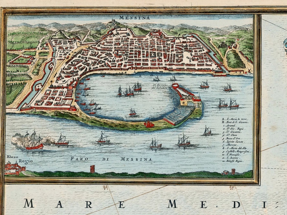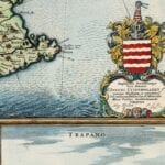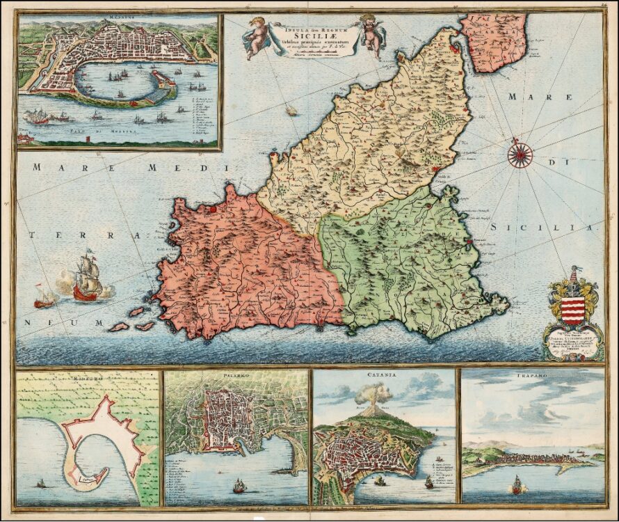 Frederick De Wit’s map of Sicily, with Messina; Milazzo; Palermo; Catania; and Trapezo. One of the most decorative maps of Sicily from the period, in striking full color, with compass rose, sailing ships and elaborate views of the major cities and ports of Sicily.