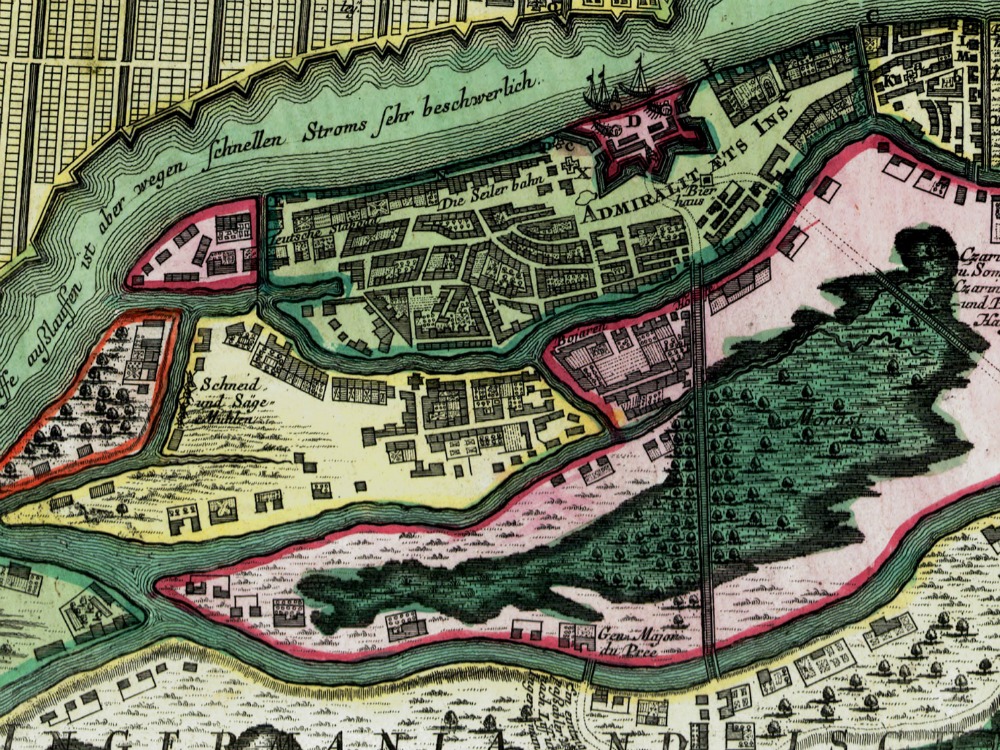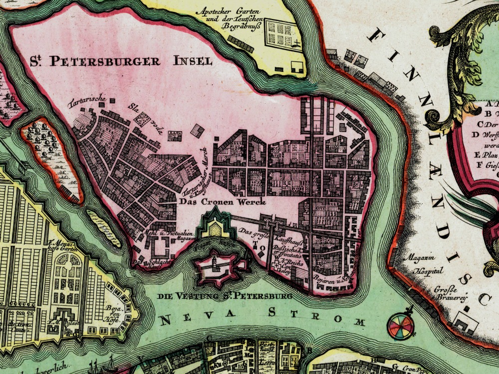Seutter’s 1703 map of St. Petersburg. In the upper third of the map is a depiction of St. Petersburg at the Gulf of Finland, the Neva River and the Lake Ladoga.