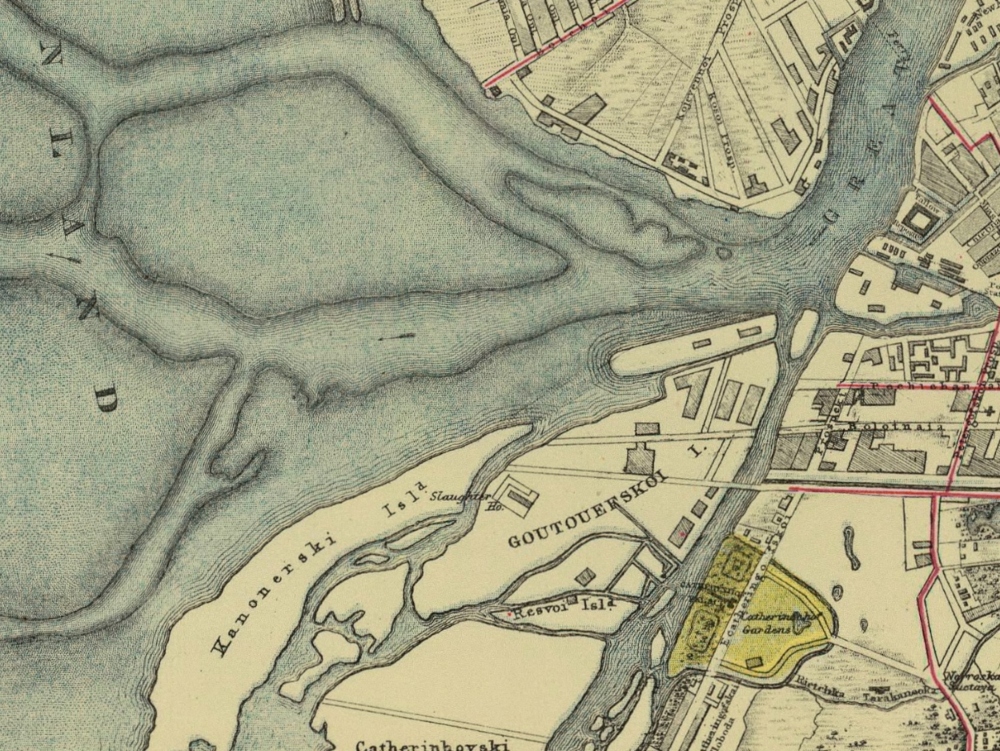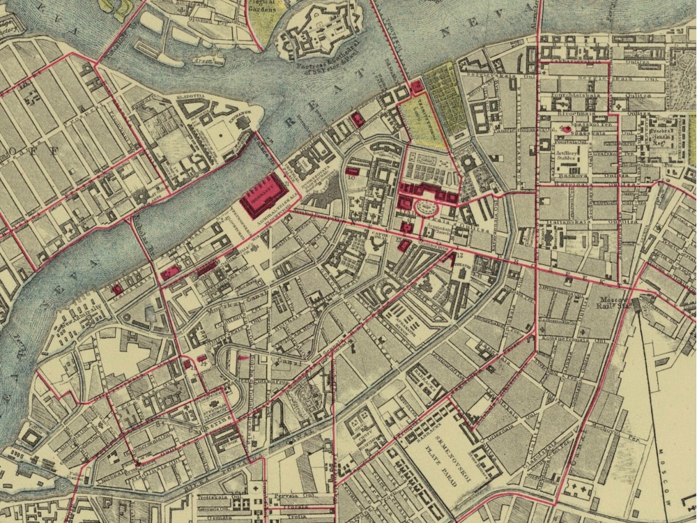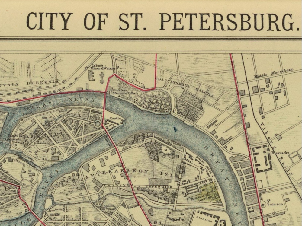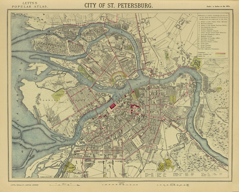 Letts’ 1883 Map of St. Petersberg from Letts’ Popular Atlas. A visually beautiful map showing Streets, Buildings, Parks, Tram Lines and Canals.