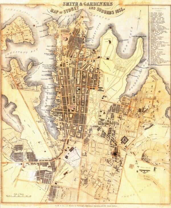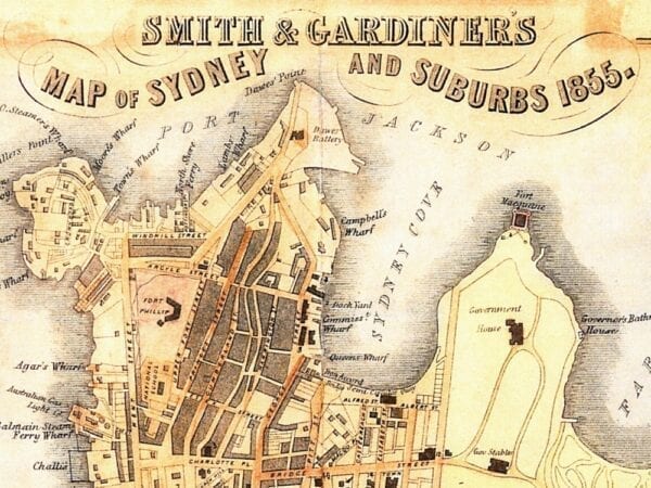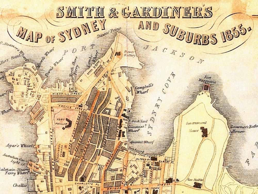 Smith & Gardiners Map of Sydney and Suburbs 1855. The map depicts the area of Sydney extending from Black Wattle Swamp Cove in the west to Toll House in the east.