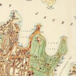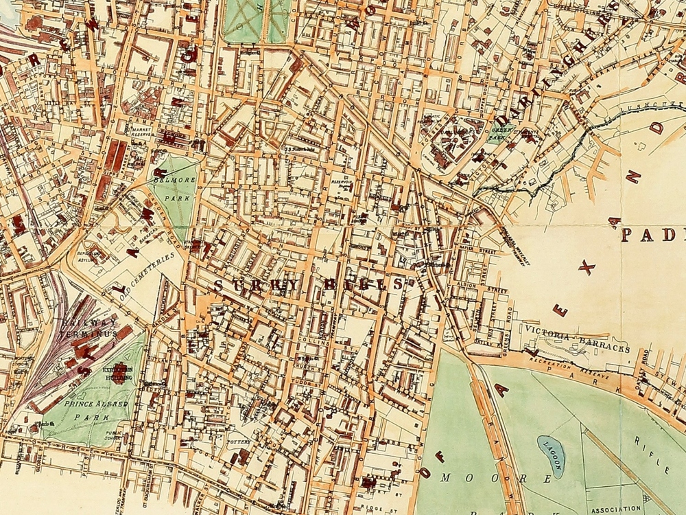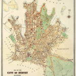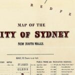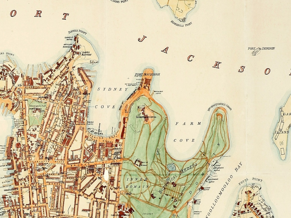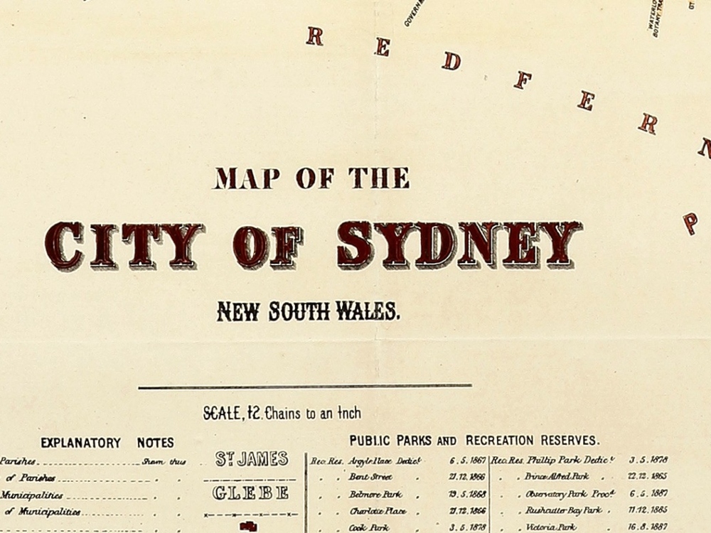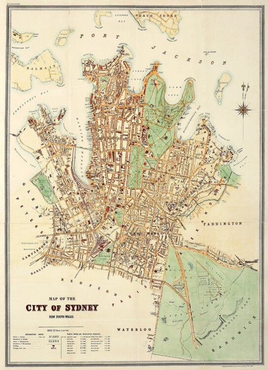 Vintage Map of Sydney, New South Wales from 1895. The map extends from the north shore to Randwick. An extensive key at lower left identifies significant places.