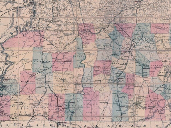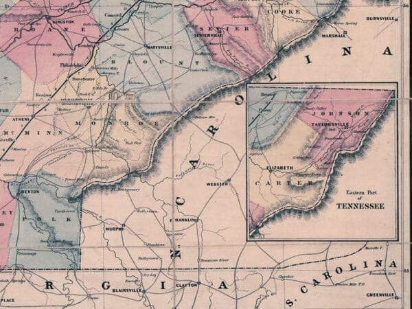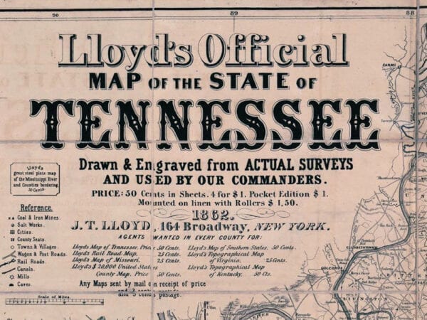 Lloyds Map of Tennessee “Entered according to Act of Congress in the year 1862 by J.T. Lloyd, in the Clerks Office of the District of the Court of the U.S. for the southern District of New York.” The Map depicts county names and boundaries, cities and towns, roads and railroads, rivers, and fortifications. Battle sites are underlined in red.