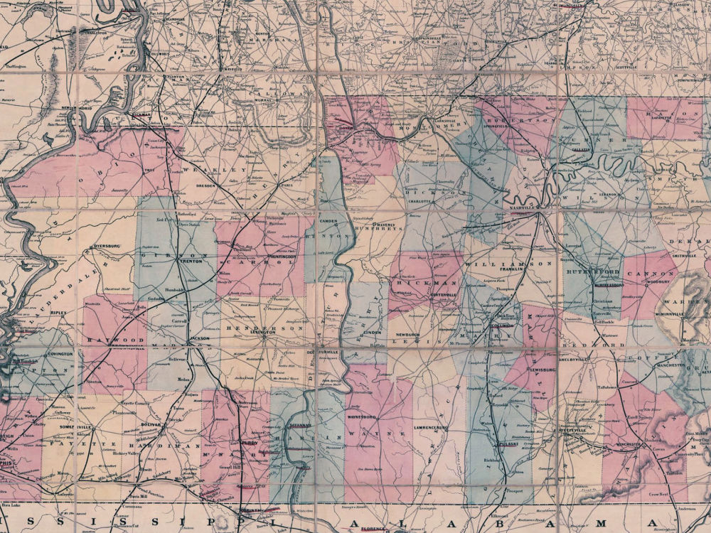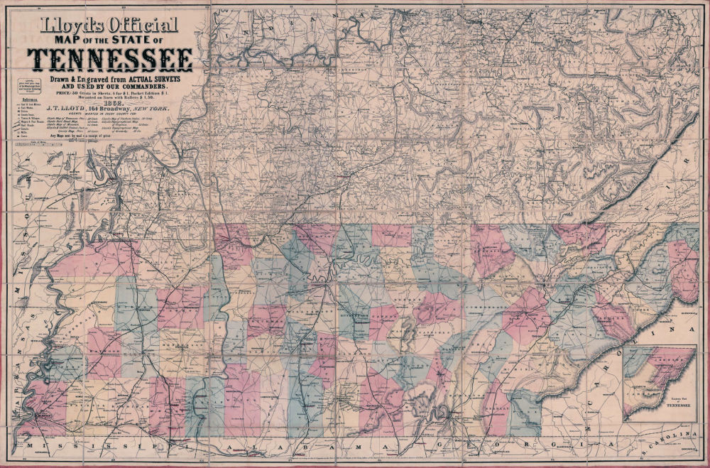 Lloyds Map of Tennessee “Entered according to Act of Congress in the year 1862 by J.T. Lloyd, in the Clerks Office of the District of the Court of the U.S. for the southern District of New York.” The Map depicts county names and boundaries, cities and towns, roads and railroads, rivers, and fortifications. Battle sites are underlined in red.