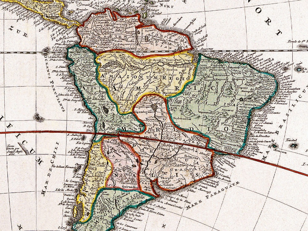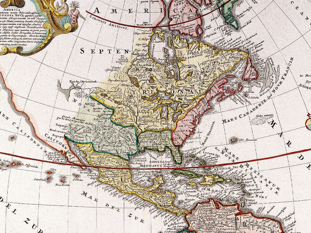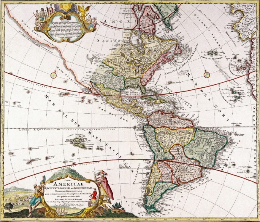 J.B. Homann’s 1720 map of The Americas spanning from the Pacific Coast of North and South America to Spain, France, and the Atlantic coast of Africa and from northern Canada and Greenland to Tierra del Fuego