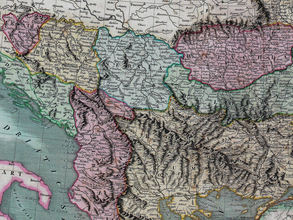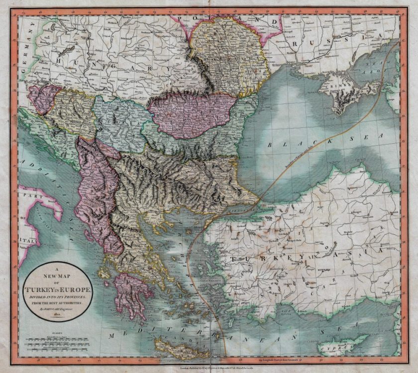 John Carys 1801 map of The Balkans. It covers the Adriatic eastward to Crimea and Southwards as far as Crete and Cyprus. It includes the modern day countries of Turkey, Greece, Albania, Macedonia, Rumania, Bulgaria, Moldova, Serbia, Bosnia, Croatia and Montenegro. Notes the line of Division between Europe and Asia as it passes through the Black Sea and the Aegean.