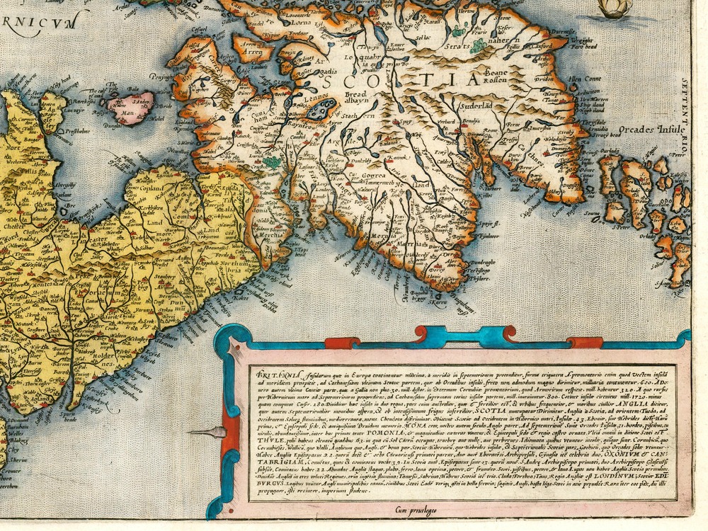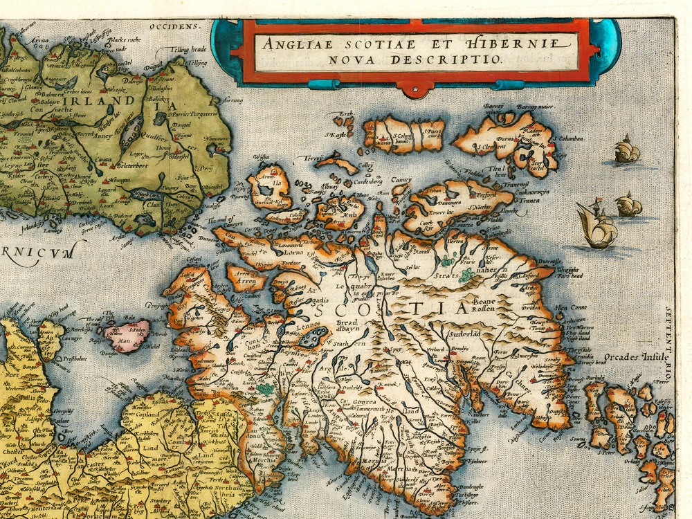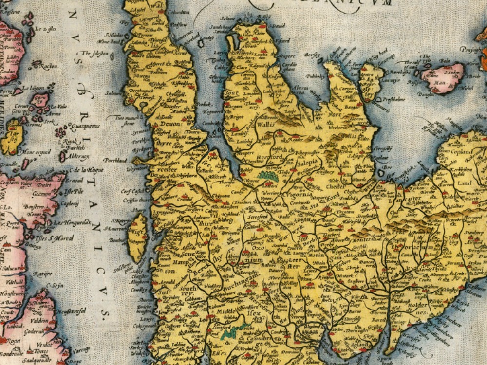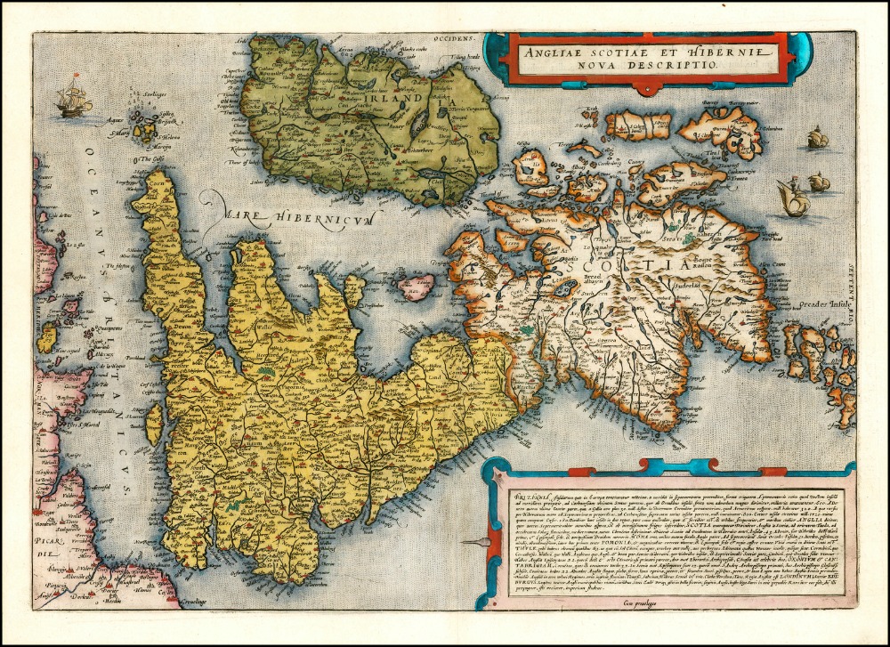 Vintage Map of the British Isles by de G. Jode from 1578, with North oriented to the right. Also showing the Northern Coast of France.