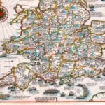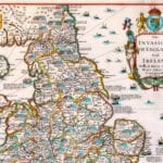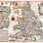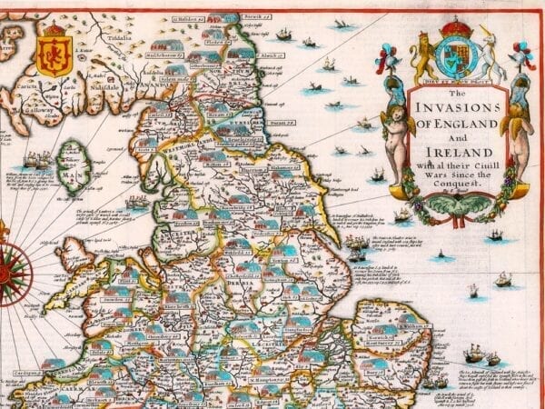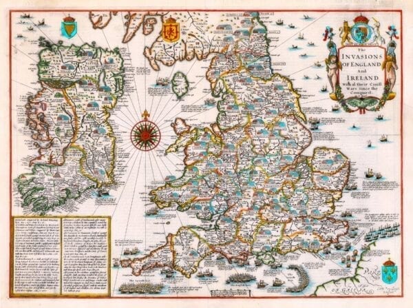 An interesting and decorative 17th century map of England & Wales and Ireland — displaying all the major battles and invasions from the Norman Conquest to the Spanish Armada – which was engraved by Cornelius Danckerts and published in John Speed’s Theatre of the Empire of Great Britaine, one of the worlds great cartographic treasures.