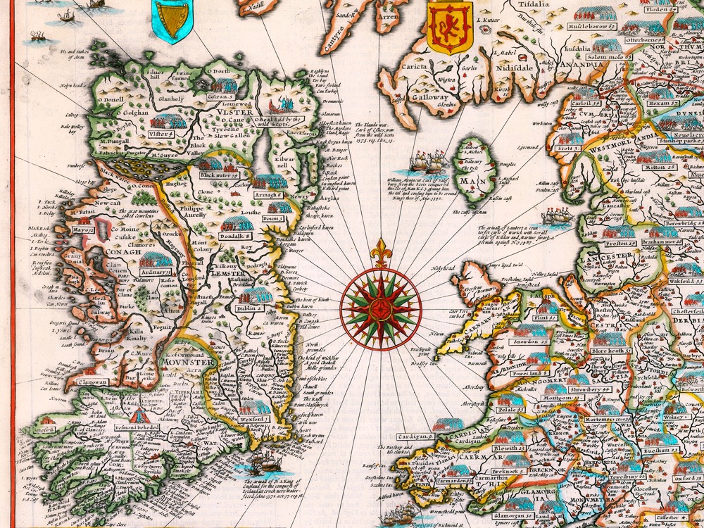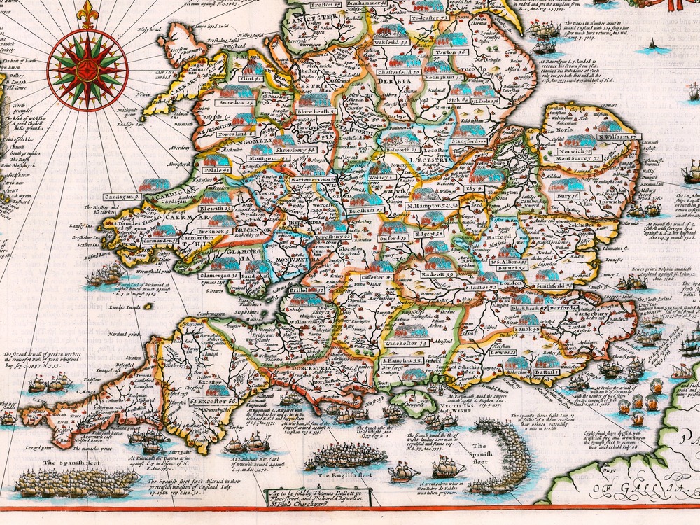 An interesting and decorative 17th century map of England & Wales and Ireland — displaying all the major battles and invasions from the Norman Conquest to the Spanish Armada – which was engraved by Cornelius Danckerts and published in John Speed’s Theatre of the Empire of Great Britaine, one of the worlds great cartographic treasures.