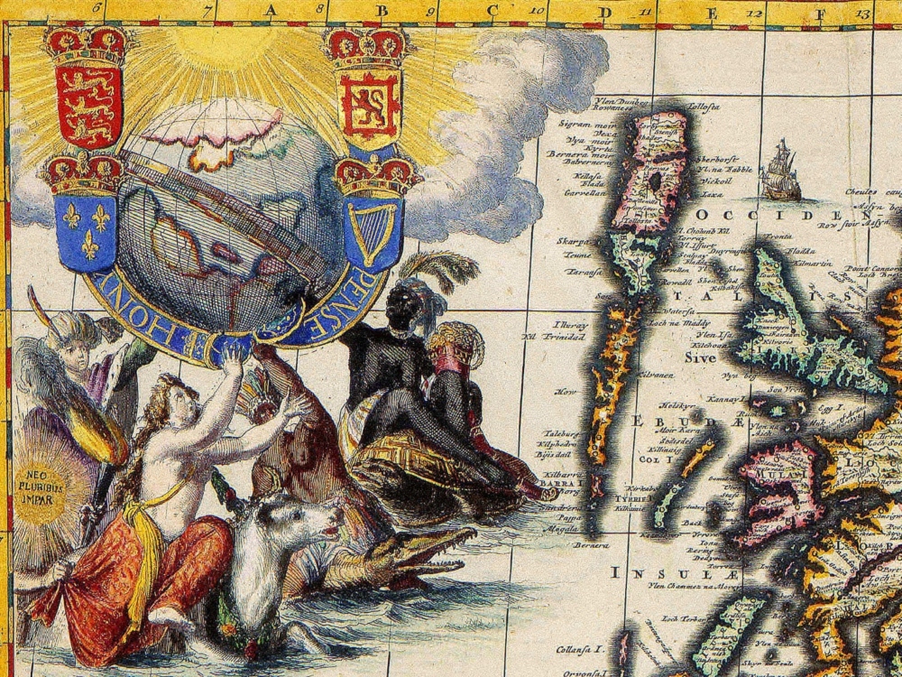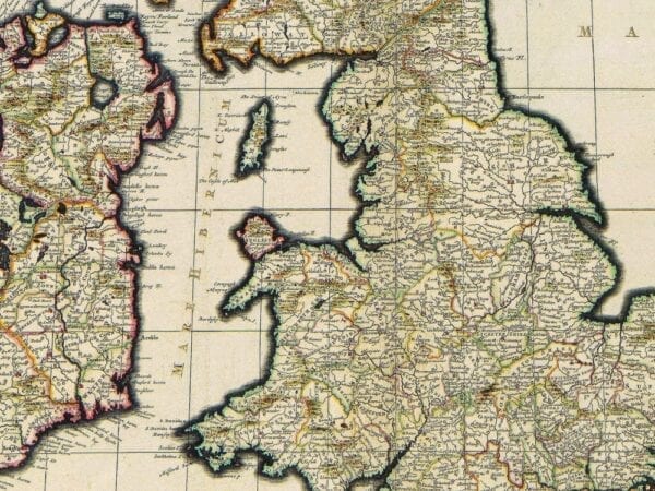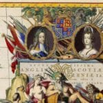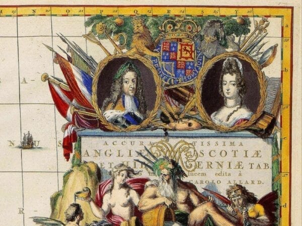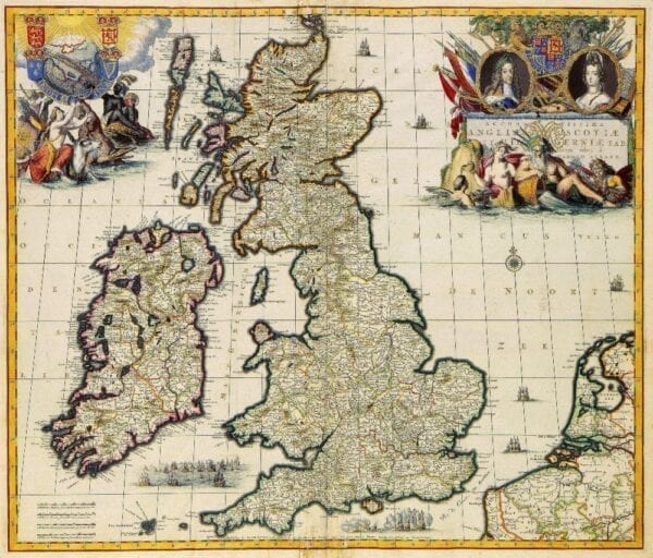 This stunning map of the British Isles from 1689 was dedicated to King William III and his wife Mary Stuart who were crowned as king and queen of England, Scotland and Ireland in 1689. Their portraits are shown in the upper right hand corner.