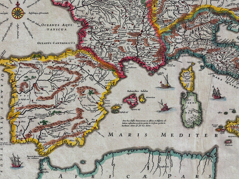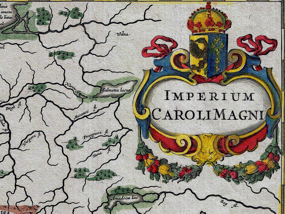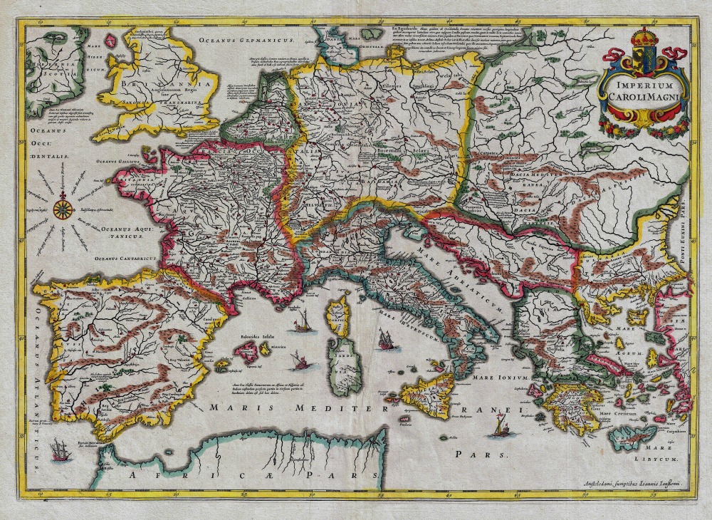 Jan Jansson’s 1657 map of the Empire of Charlemagne. It covers from Spain to the Black Sea and from Denmark and Ireland to North Africa. Showing numerous decorative sailing vessels in the Mediterranean. A decorative title cartouche appears in the upper right quadrant.