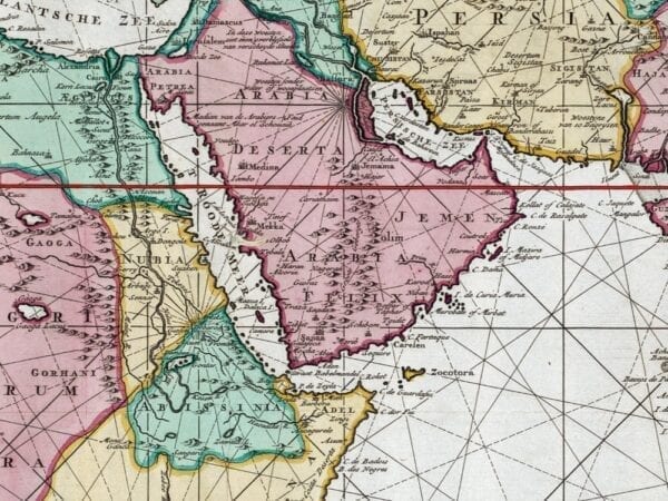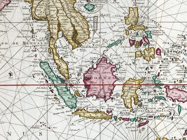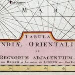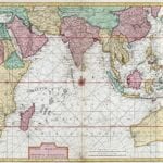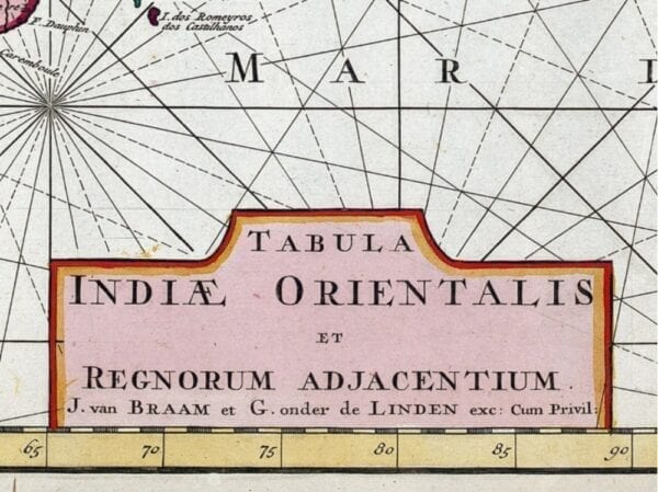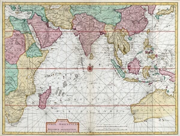 Braam and Linden’s 1724 Map of The Indian Ocean shows the Middle East, the Indian Ocean, the Far East, and much of Australia. The map features a fine depiction of the outlines of the western two-thirds of Australia, based on the discoveries of explorers working for the Dutch East India Company.