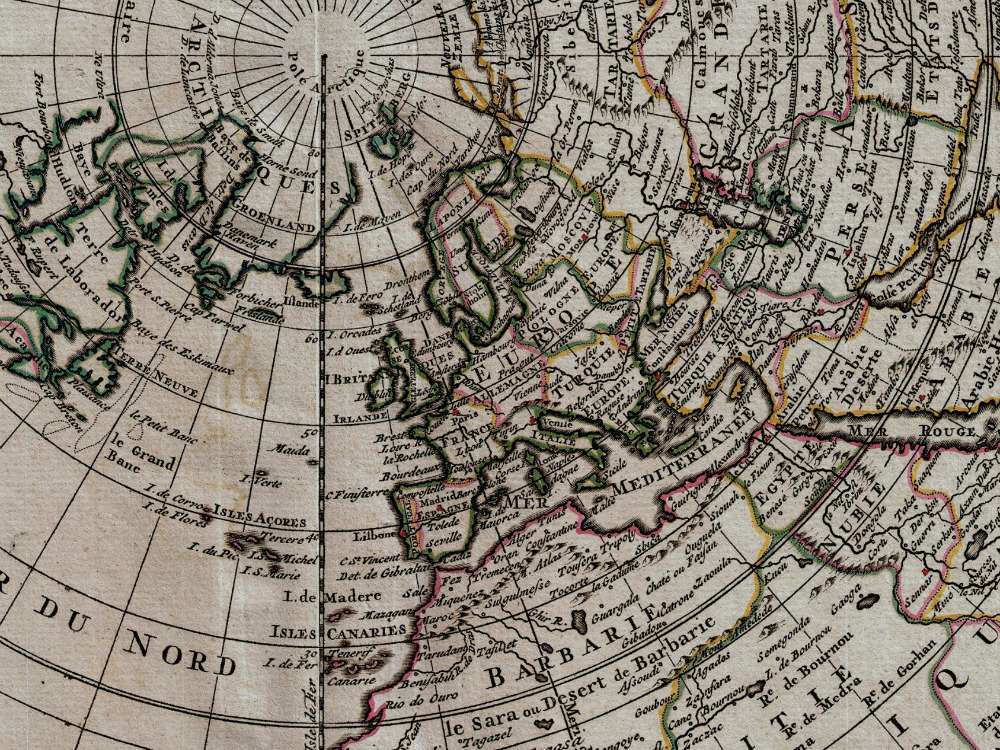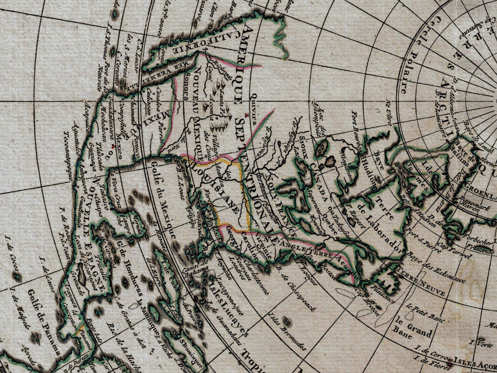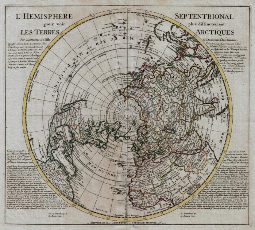 A stunning and important map of the Northern Hemisphere originally drawn by Guillaume de L’Isle in 1714 and updated by Coven’s and Mortier in 1741. The map is shown from the perspective of the North Pole south in all directions to include the Arctic Regions, all of North American, Central America, Asia, and Europe with parts of South America and most of Africa.
