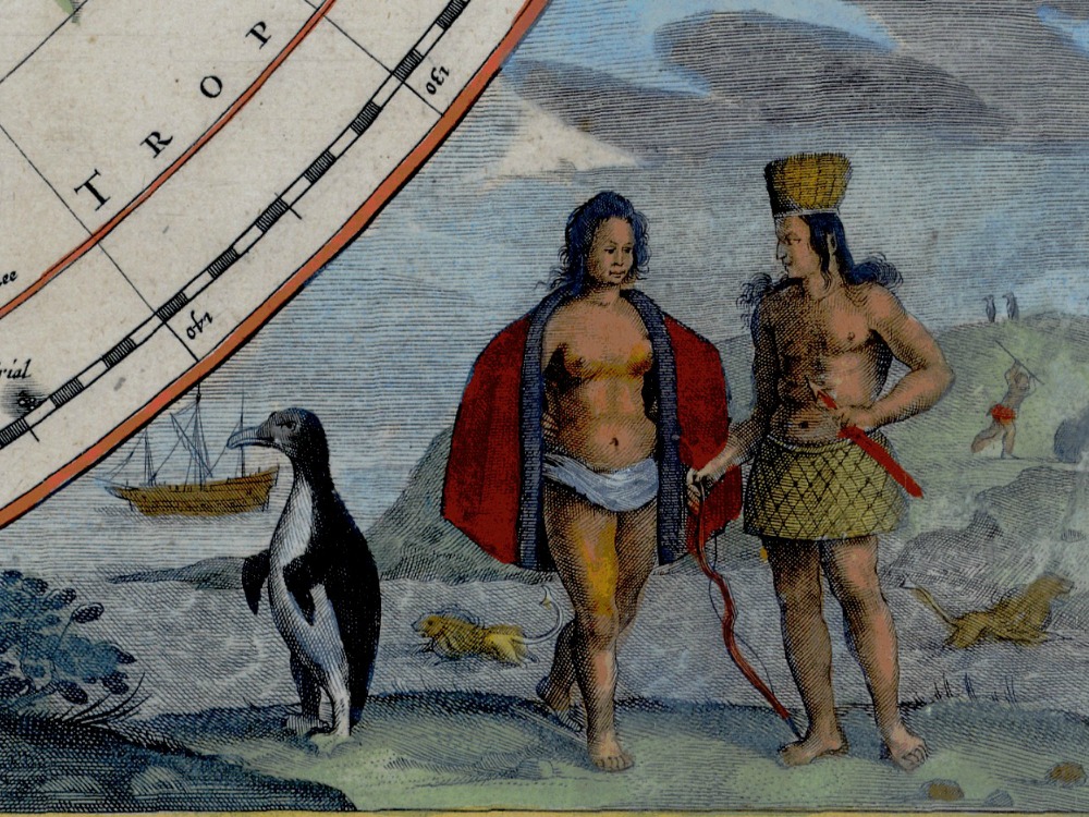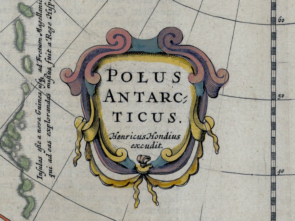 Hondius’ 1638 map of the world from the perspective of the South Pole. A beautiful map with native scenes in the four corners including a penguin.