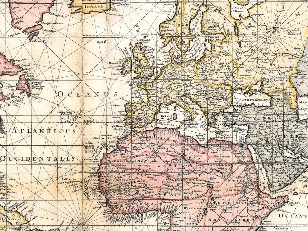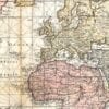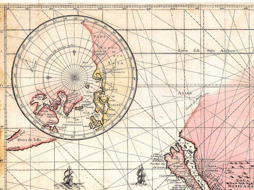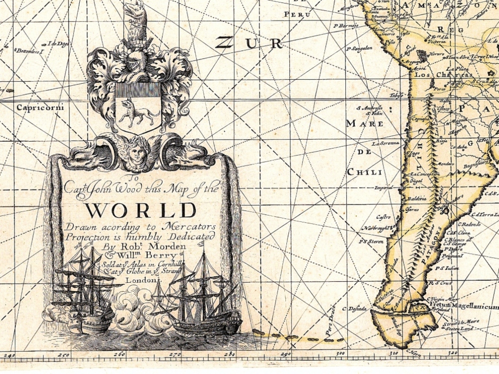 Morden’s Map of the World from 1671 dedicated to Captain John Wood. Australia is shown as “Holandia Nova” but its eastern area is blank as is northeastern Asia. South of Australia is “Ant. Van Dieman’s land.”