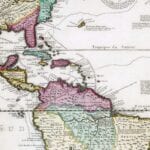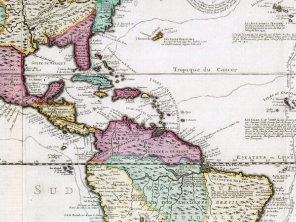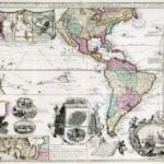 Fine Map of the World in 1707 by Andries De Leth. The map centers on America and shows the tracks of famous navigators like Magellan and Schouten, who both discovered a western entrance into the Pacific Ocean. The map shows the trade route from Europe to Southeast Asia, via Mexico and the west coast of North America.