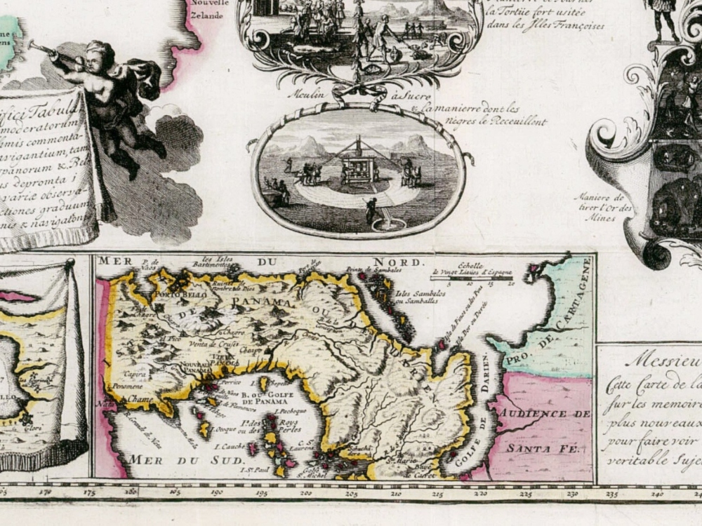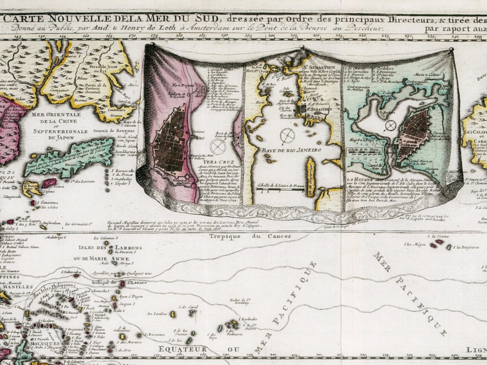 Fine Map of the World in 1707 by Andries De Leth. The map centers on America and shows the tracks of famous navigators like Magellan and Schouten, who both discovered a western entrance into the Pacific Ocean. The map shows the trade route from Europe to Southeast Asia, via Mexico and the west coast of North America.