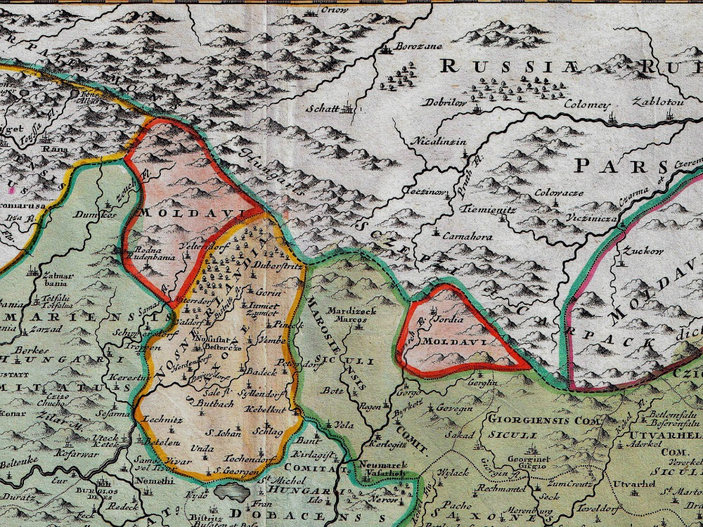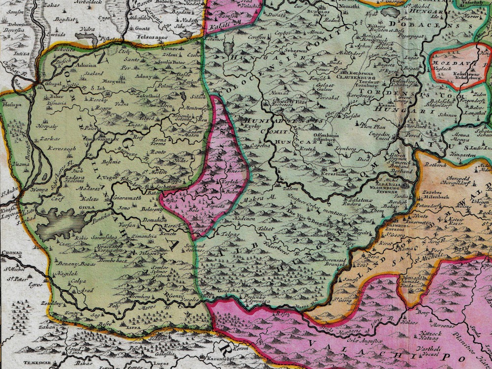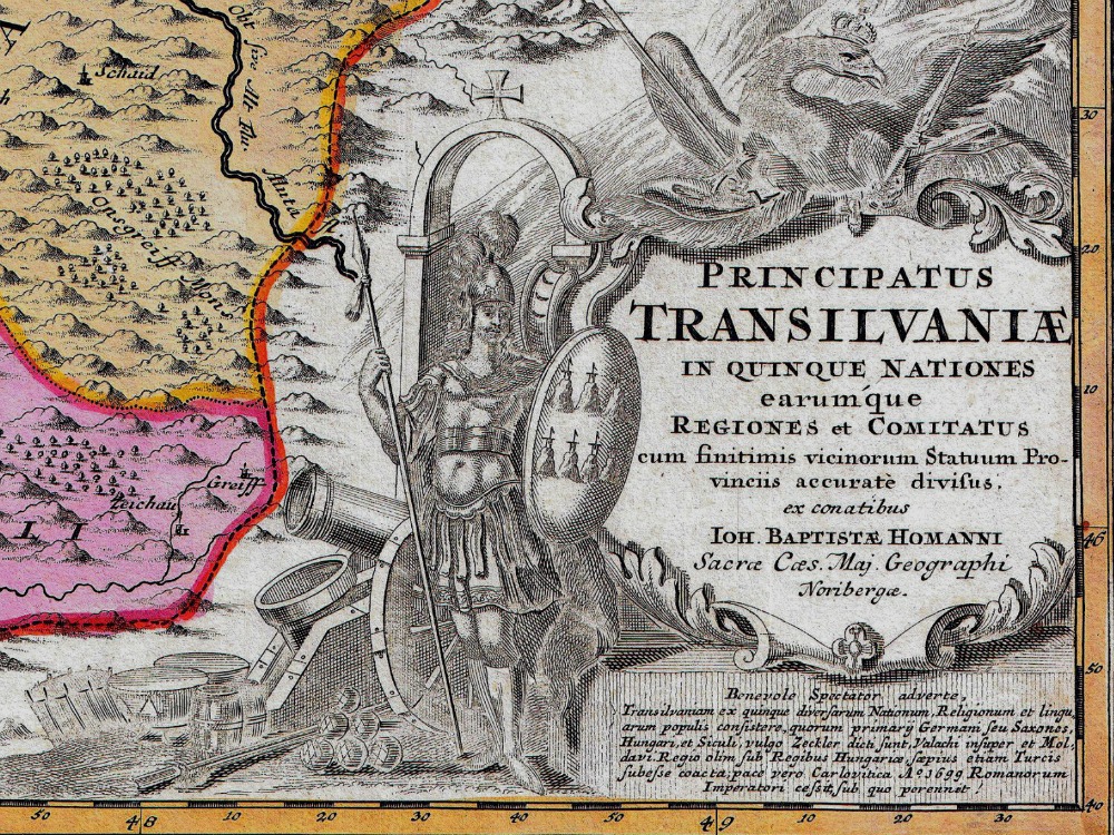J. B. Homanns 1716 map of Transylvania (modern day Northern Romania). The map shows villages, cities, forests, rivers, monasteries, castles, and lakes and a large decorative military themed cartouche in the lower right quadrant.