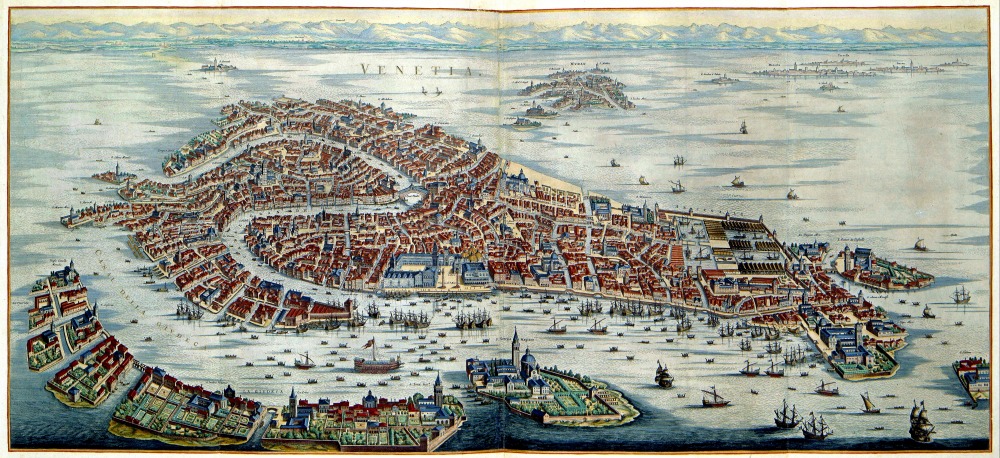 Mortier’s 1704 Panoramic View of Venice. Based on the 17th Century Map of Joan Blaeu. Magnificent full colour map showing the various canals and waterways of this truly unique city.