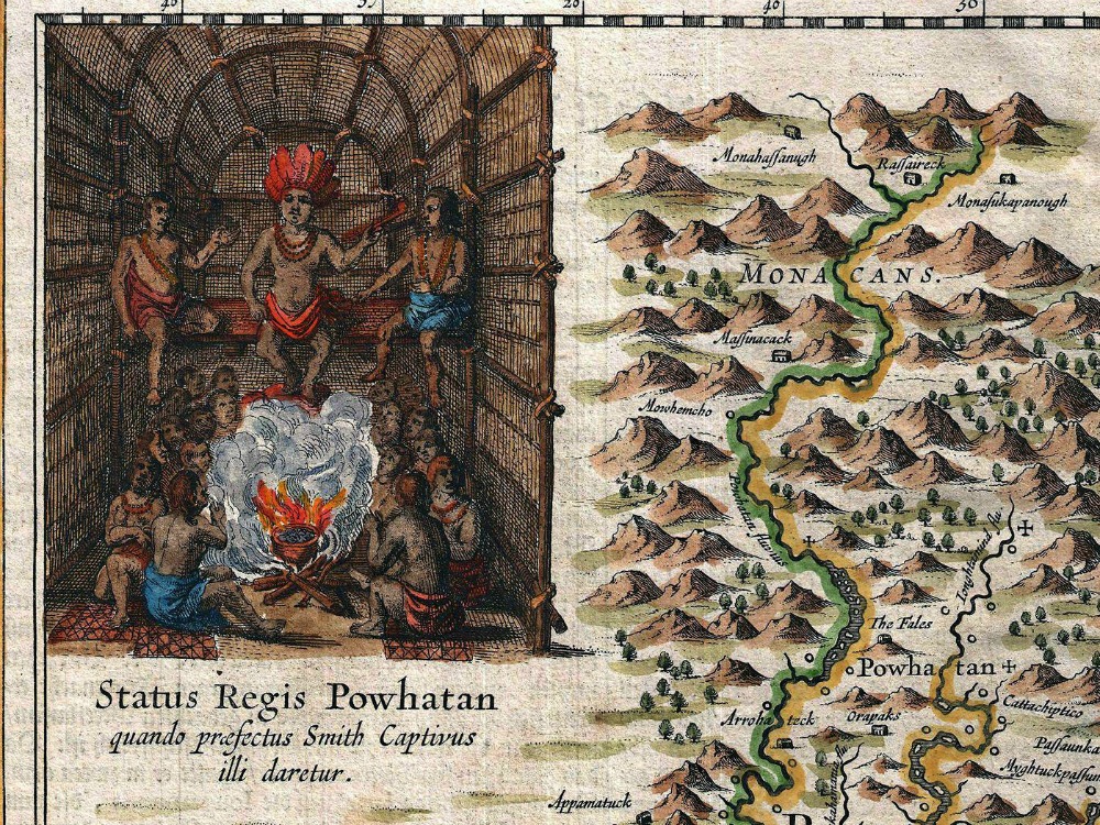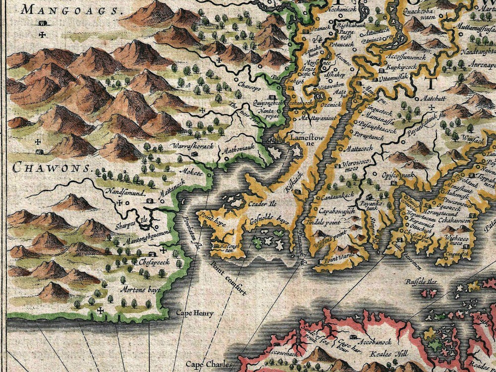 Hondius 1630 map of the Virginia colony and the Chesapeake Bay. Oriented with North to the right, this map covers from Cape Henry to the Susquehanna River and inland as far as the Appalachian Mountains. It was based on the early map of English settler John Smith of 1612.