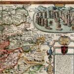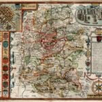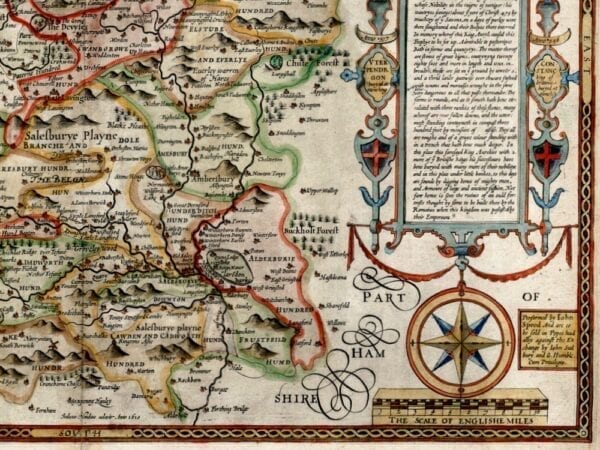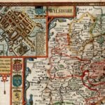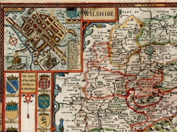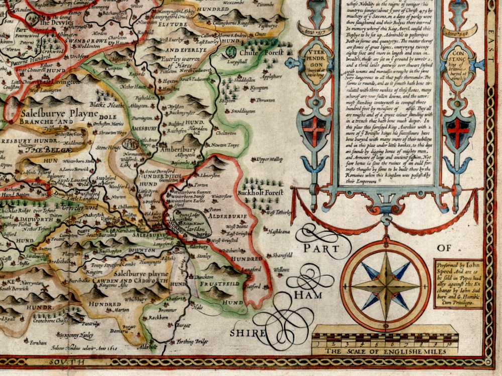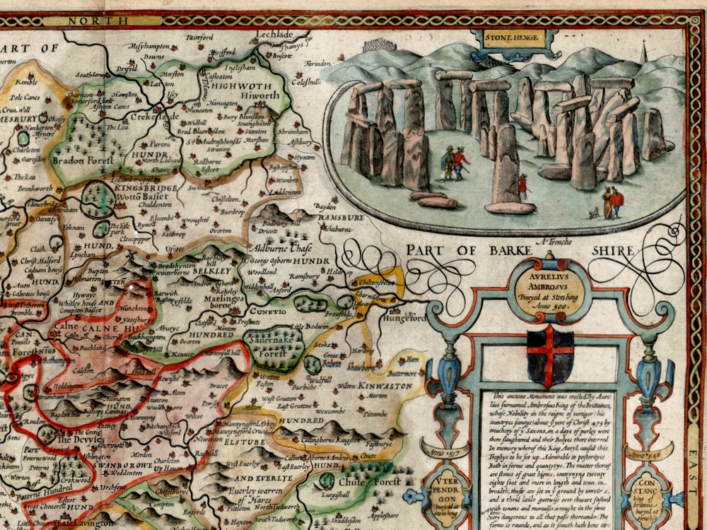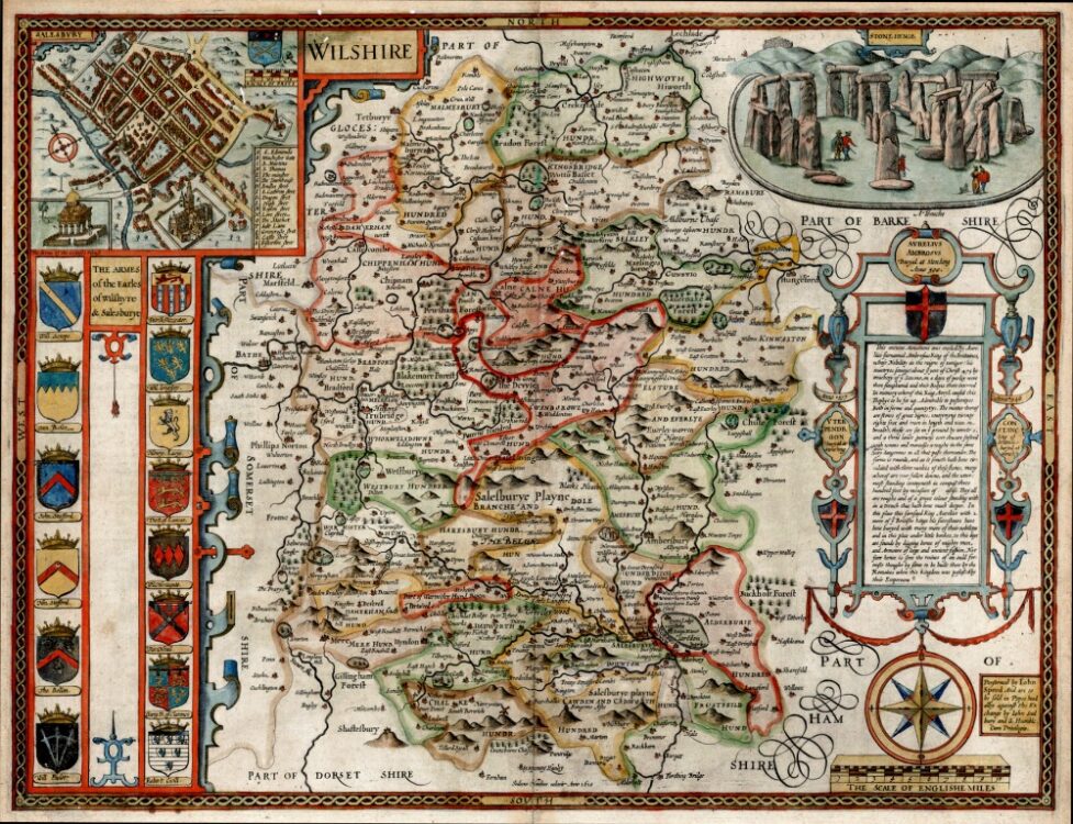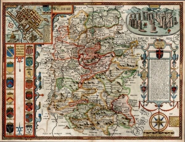 John Speed’s Medieval Map of Wiltshire from 1611. The Map first appeared in Speed’s Theatre of the Empire of Great Britaine is one of the worlds great cartographic treasures. Published in 1611/12, it marked the first time that comprehensive plans of English and Welsh counties and towns were made available in print. Stonehenge appears in the upper right hand corner.