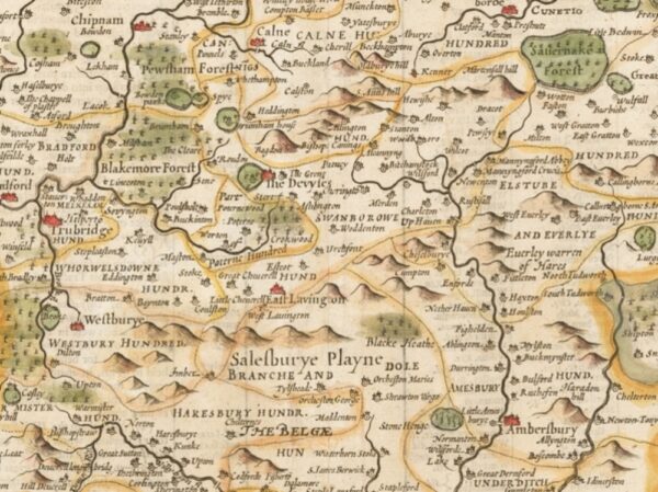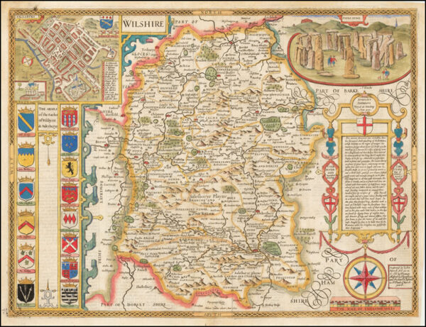 Vintage Map of Wiltshire from John Speed’s Theatre of the Empire of Great Britaine 1676, to this day one of the most important Atlases ever produced.
