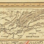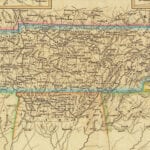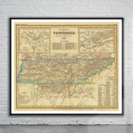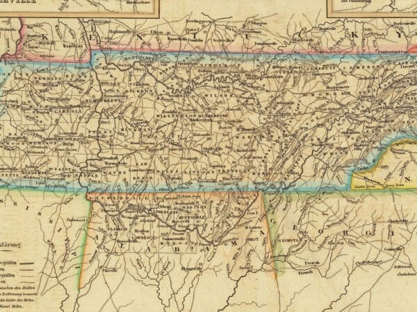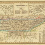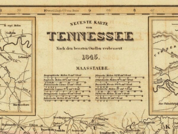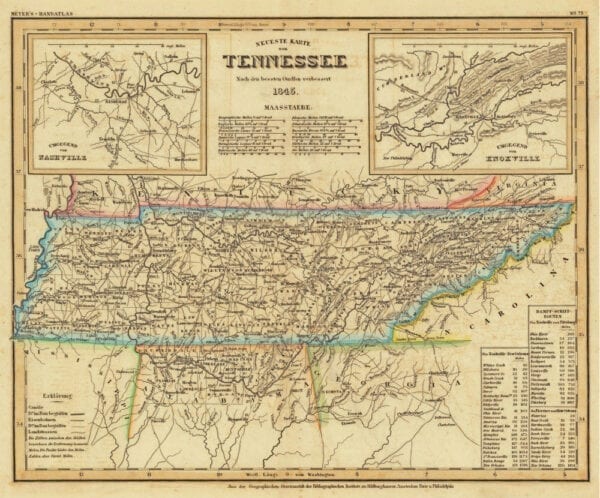 Joseph Meyer’s Map of Tennessee from 1845. The Map depicts counties, towns, roads, canals, lakes, etc. In the top left and right corners are detailed insets of Knoxville and Nashville.