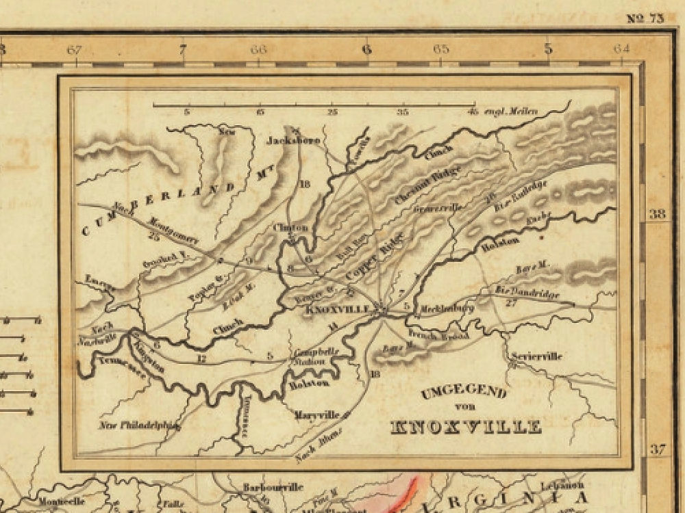 Joseph Meyer’s Map of Tennessee from 1845. The Map depicts counties, towns, roads, canals, lakes, etc. In the top left and right corners are detailed insets of Knoxville and Nashville.