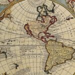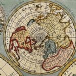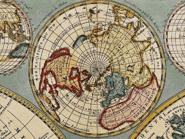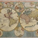 Nolin’s World Map has California depicted as an island, on the main map as well as three of the smaller maps. Australia is partially delineated, as also New Zealand, and above the island of California is a blank space. Around the two main hemispheres are two smaller ones oriented on Paris and its antipodean opposite; north and south polar projections; one cordiform and two truncated oval projections; and two wind directional figures.