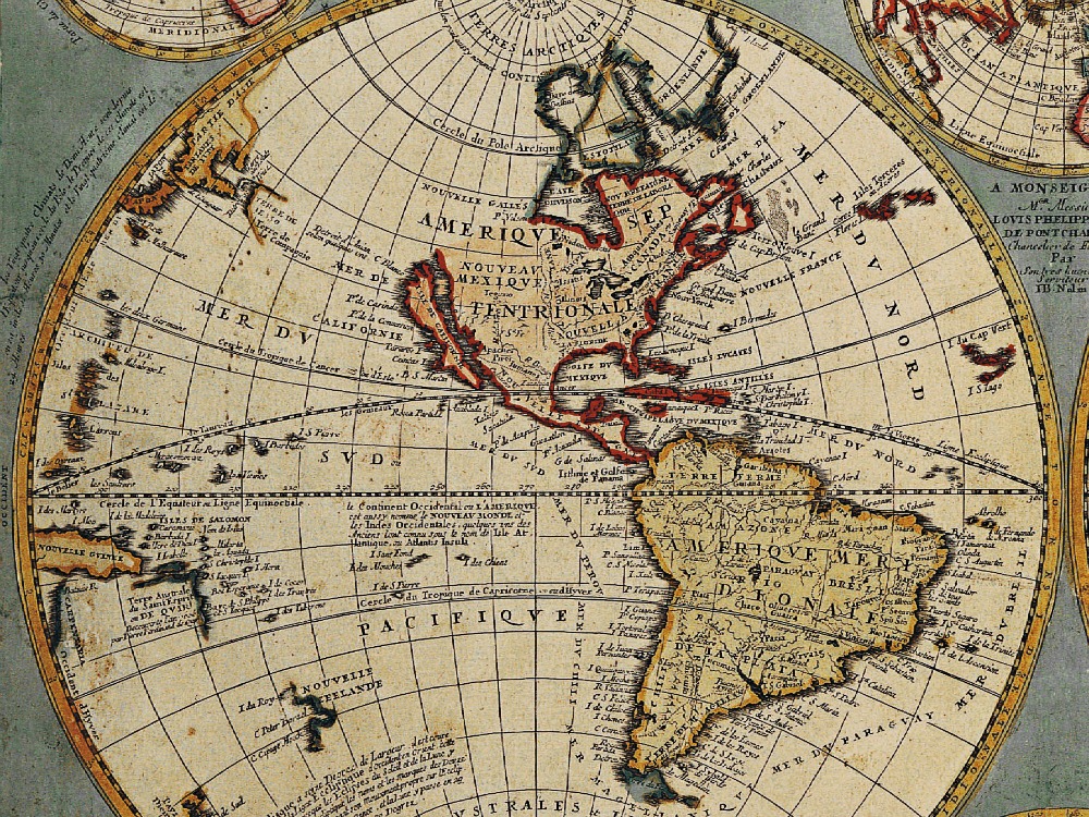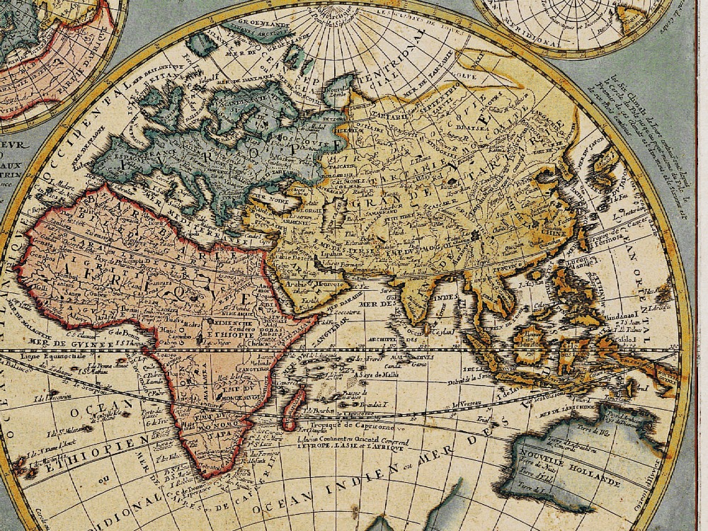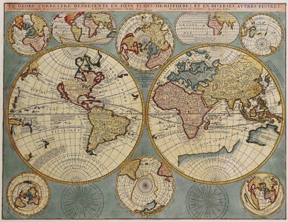 Nolin’s World Map has California depicted as an island, on the main map as well as three of the smaller maps. Australia is partially delineated, as also New Zealand, and above the island of California is a blank space. Around the two main hemispheres are two smaller ones oriented on Paris and its antipodean opposite; north and south polar projections; one cordiform and two truncated oval projections; and two wind directional figures.