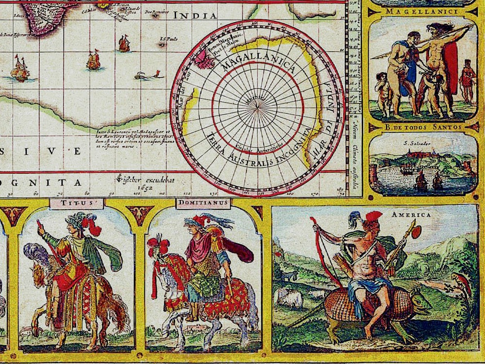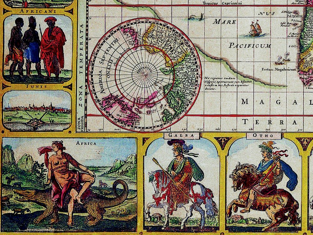 Piscator’s famous world map from 1652 with scenes of twelve Roman emperors mounted on horses in full battle gear along with representations of the four continents, six costumed figures showing the mode of dress in each of the regions.
