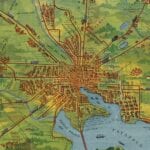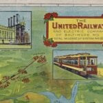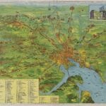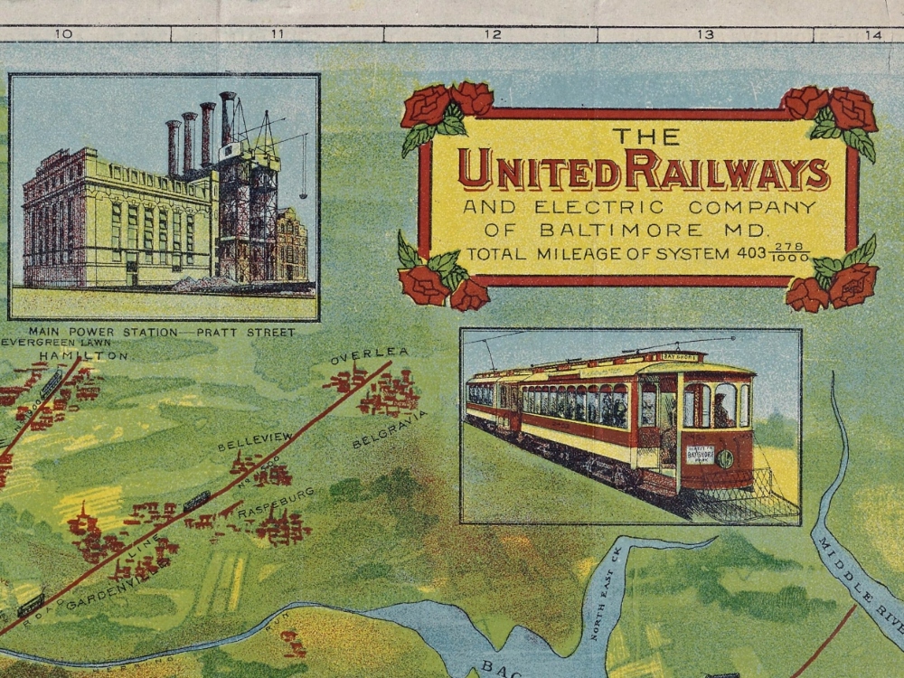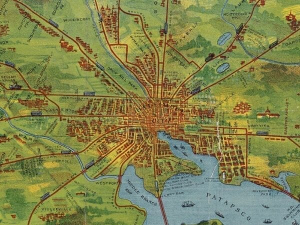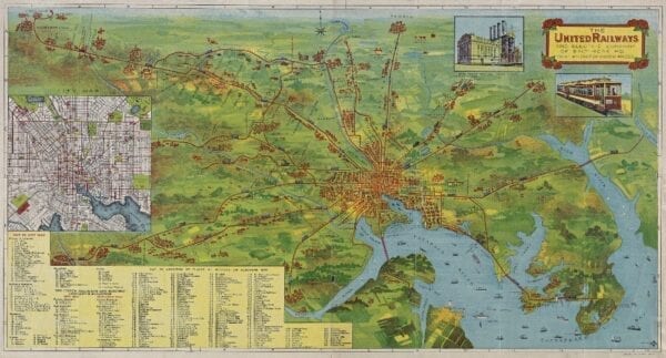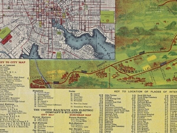 Vintage Map of Baltimore from 1910 showing the Trolley Lines in opertation at the time. The inset in the bottom left lists all of the places of interest in the city and suburbs.