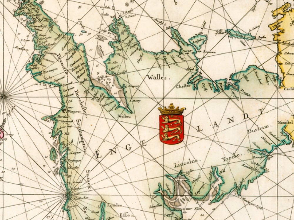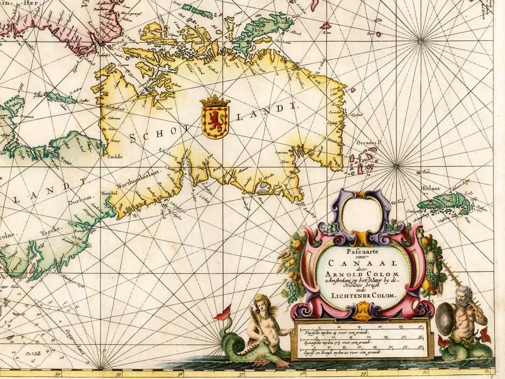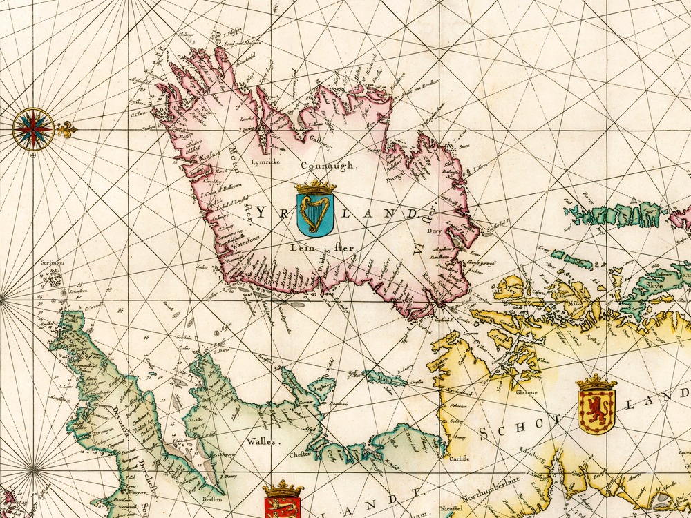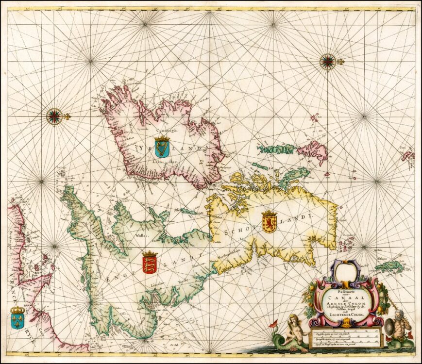 Pieter Goos’ Seas Chart of the British Isles from 1669. A rare and striking map, centred on the Isle of Man, and oriented with west to the top.