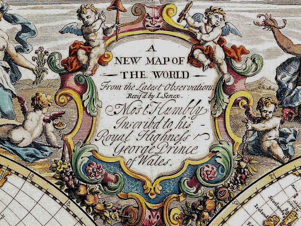 The highly detailed Senex world map from 1721. The map includes 4 smaller Northern and Southern Hemisphere projections, an armillary and other scientific drawings. California is shown as an island and both New Zealand and Australia have incomplete coastlines, there is no sign of Antarctica, and New Guinea is shown as connected to Australia.